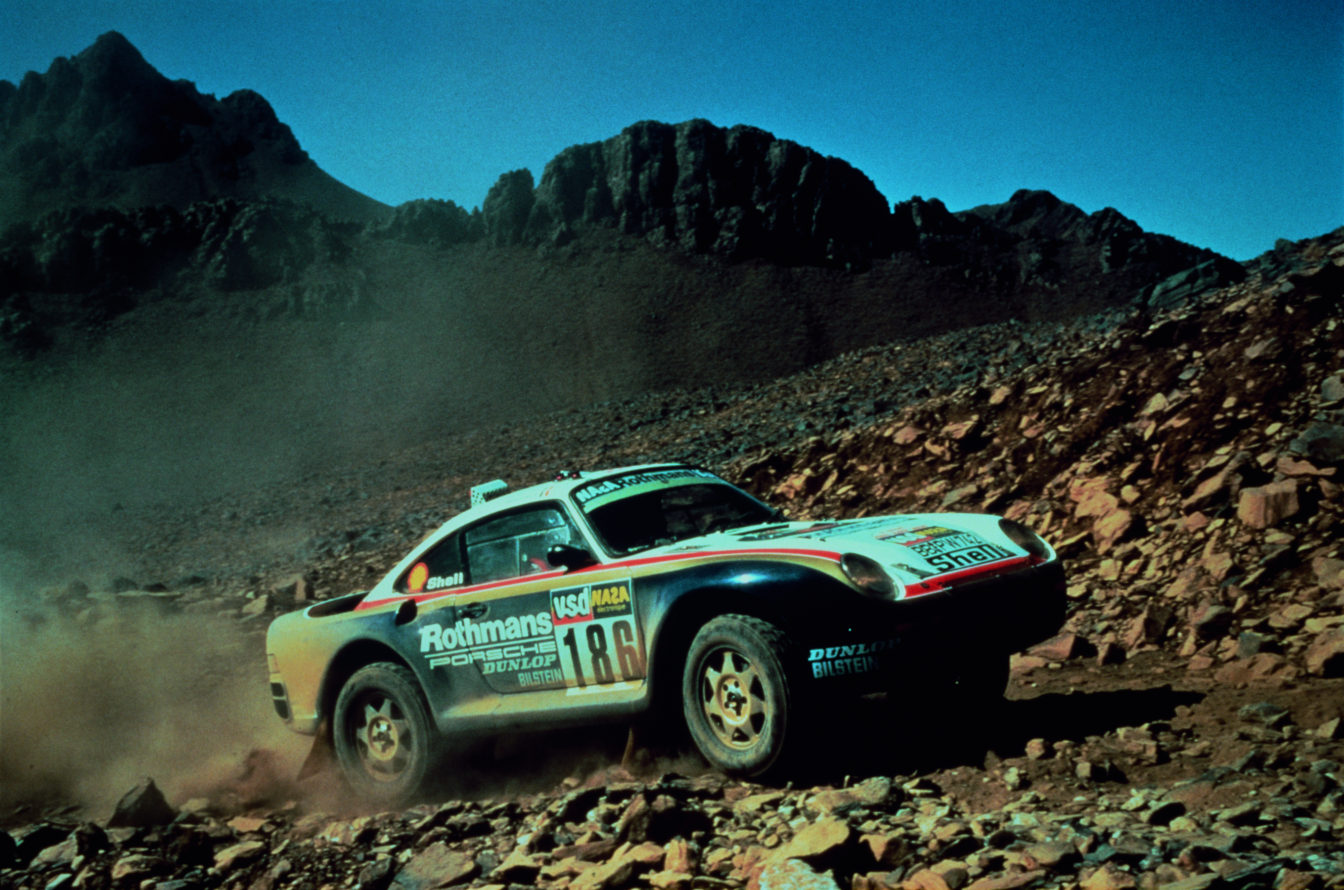 1986 Paris-Dakar Rally In 1986 Porsche repeated its 1984 Paris-Dakar victory with René Metge and Dominique Lemoyne. They drove the 959 with a 2.8 l turbo engine from 1st to 22nd January. Owing to the lower petrol quality, its performance was reduced to 400 HP. 959 "Paris-Dakar" (1986): air/water-cooled 6-cyl. bi-turbo boxer engine 2849 cm3, 400 HP, 1260 kg
