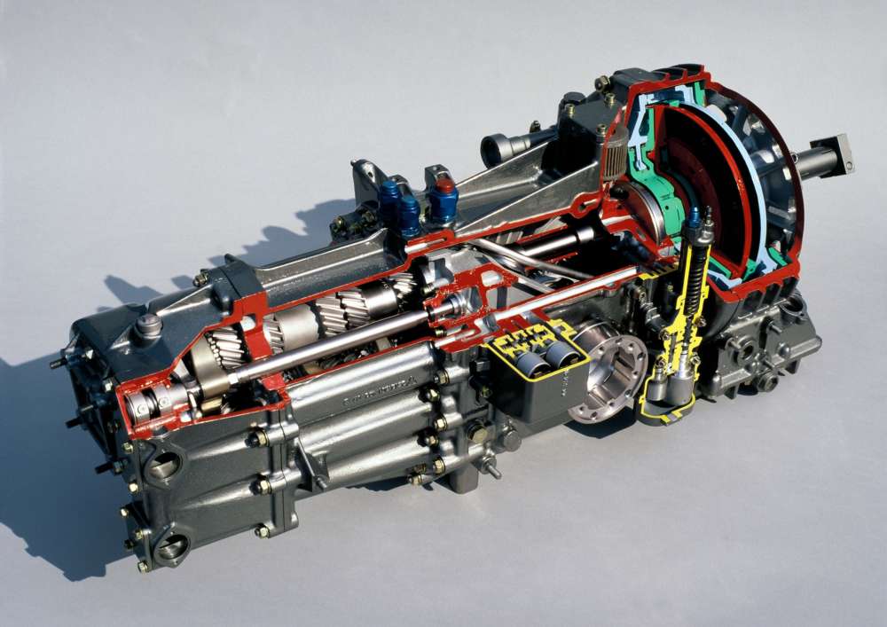 Cutaway model of a Porsche twin-clutch gearbox (PDK)