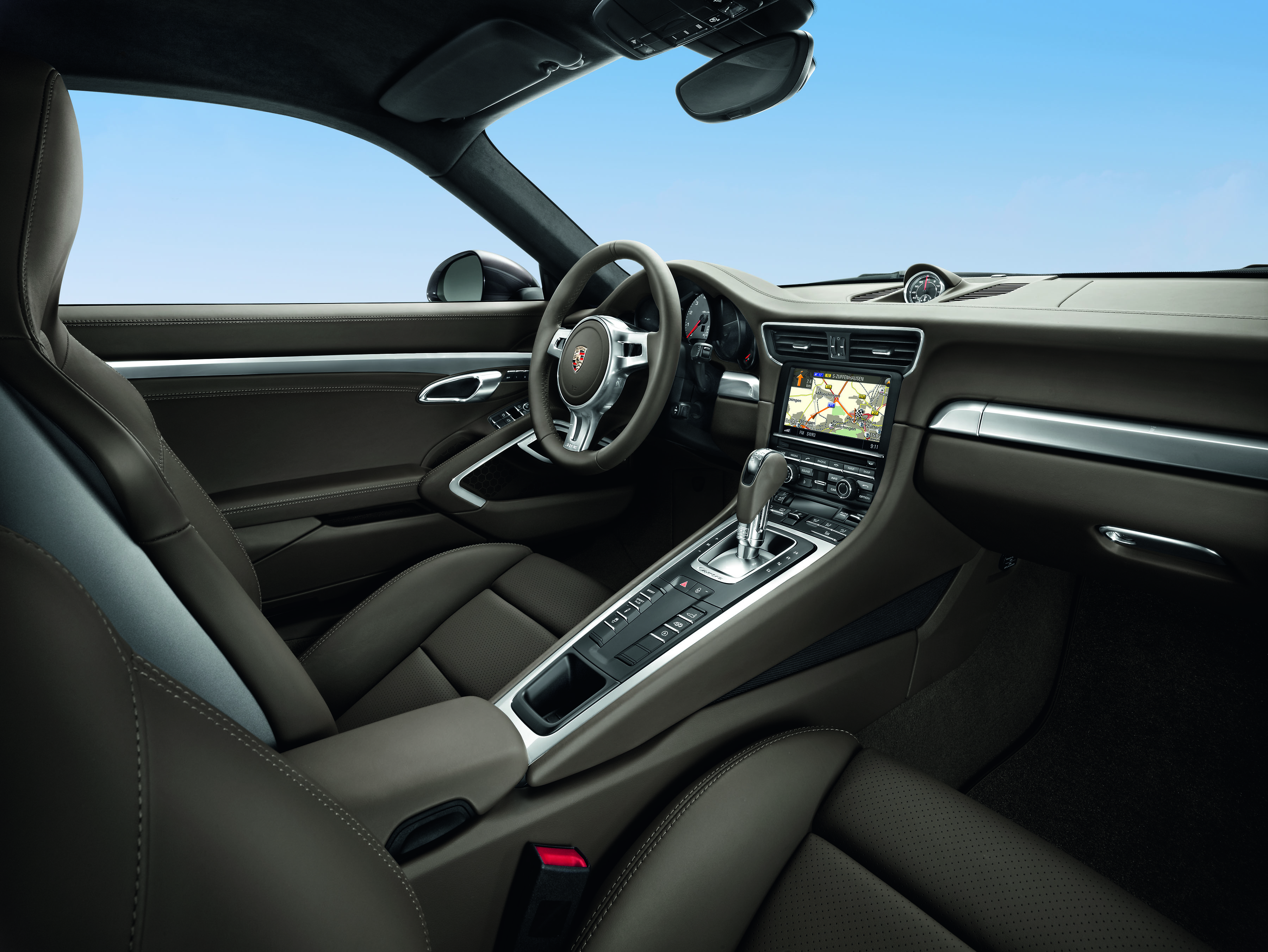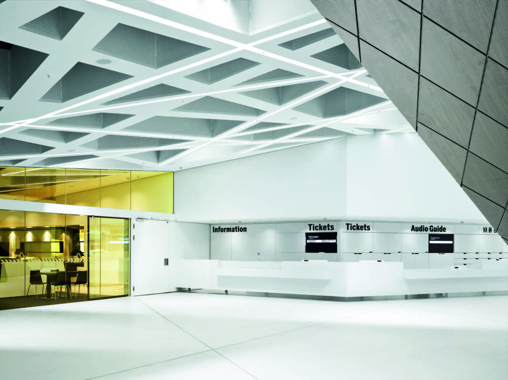 The Foyer of the new Porsche-Museum with a view into the Museum Restaurant âBoxenstoppâ (left)