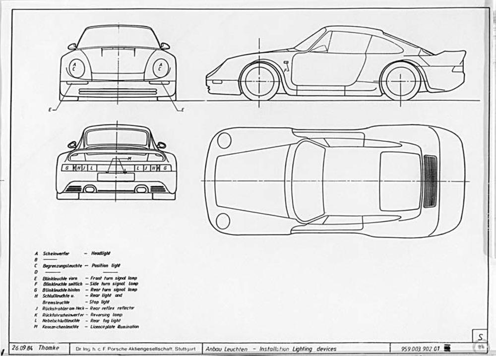 Engineers diagrammed the lighting devices for the 959, completing the drawing on September 26, 1984. With its dual-language legend, it clearly was intended for export purposes. Porsche Archiv