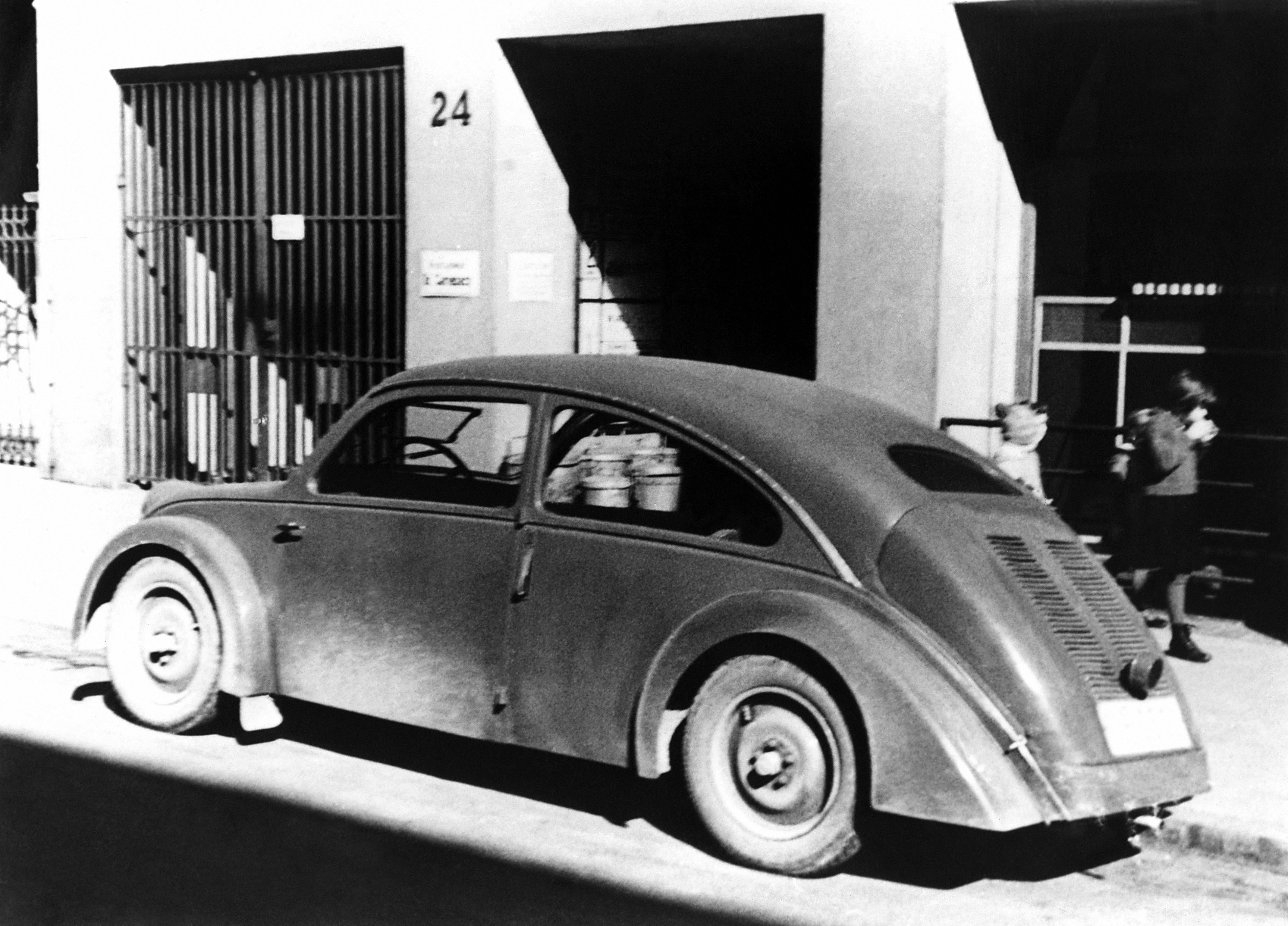 The small automobile prototype Type 32 designed for NSU in 1933 in front of the Porsche Engineering Office, KronenstraÃe 24, Stuttgart