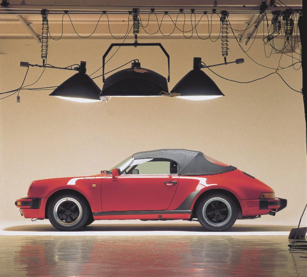 When Porsche put the 3.2 Carrera Speedster into production, Zuffenhausen offered the car in standard width body and Turbo Look. The manual cloth top folded underneath a rigid fiberglass tonneau cover that also covered the rear of the passenger compartment. Porsche Archiv