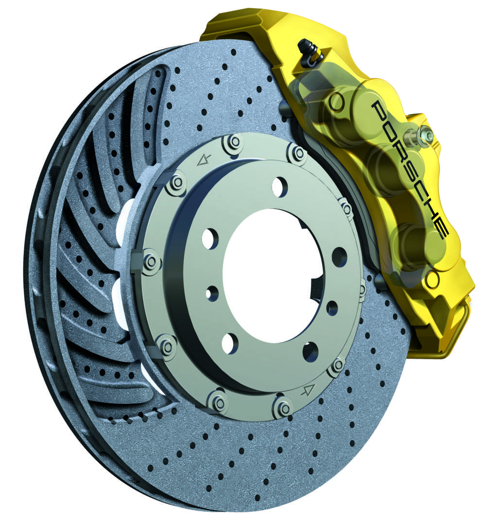 Phantom graphic of the perforated ceramic brake disc with involute cooling channels and six-piston brake caliper