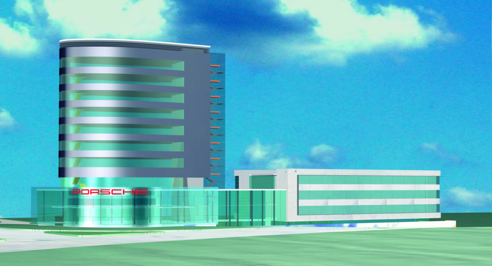 Model of the Porsche Service Center in Bietigheim-Bissingen, the future headquarters of Porsche Consulting GmbH, Porsche Deutschland GmbH and Porsche Financial-Services GmbH