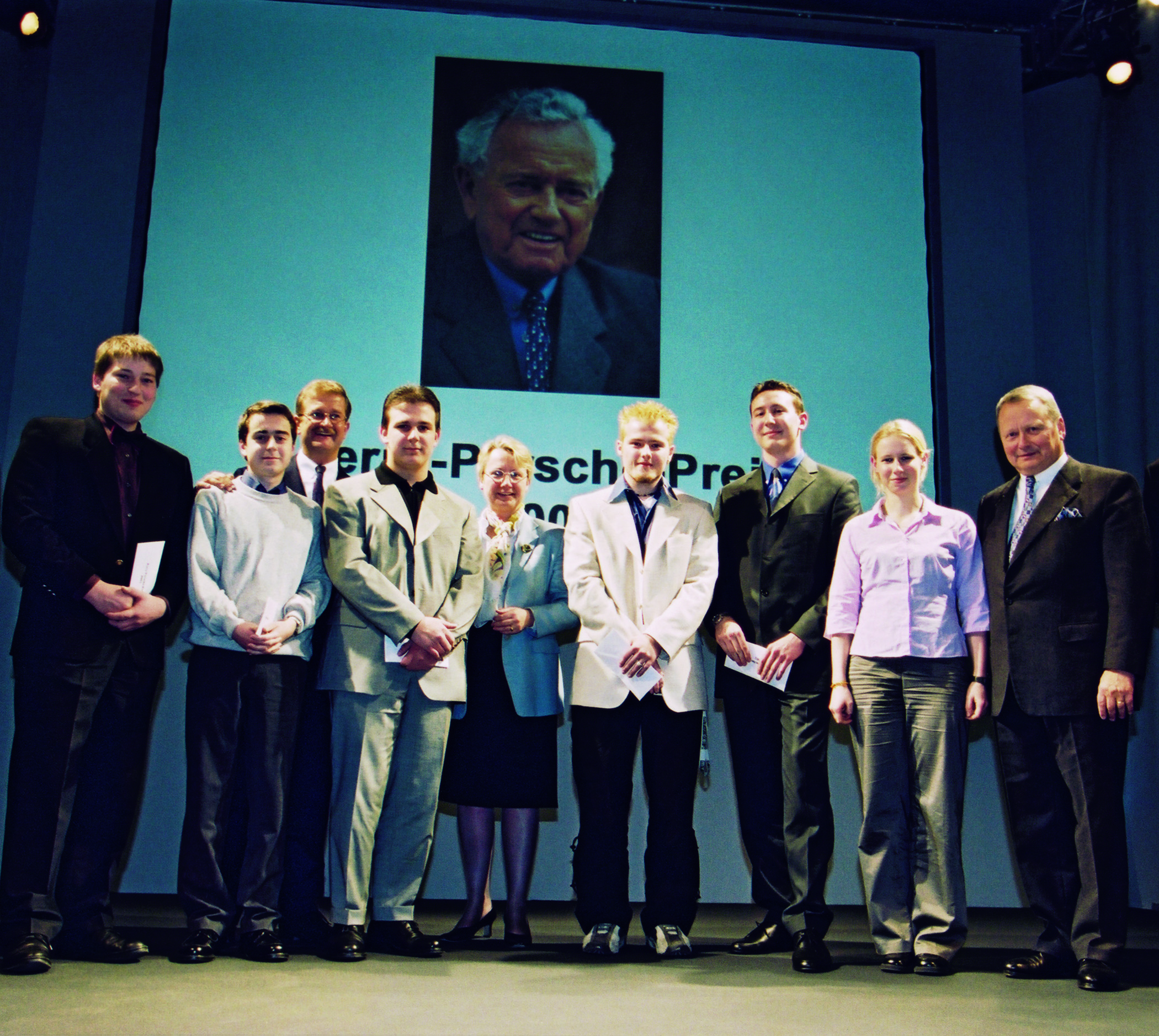 The photograph shows, from left to right: Hans-Peter Reck, Thomas Müller, Dr. Wendelin Wiedeking, Nikolaus Moll, Dr. Annette Schavan, Axel Neumayer, Fabian Schmidt, Kerstin Hornung (Ferdinand Porsche Grammar School, Stuttgart-Zuffenhausen, speaker for the prizewinners), Dr. Wolfgang Porsche.