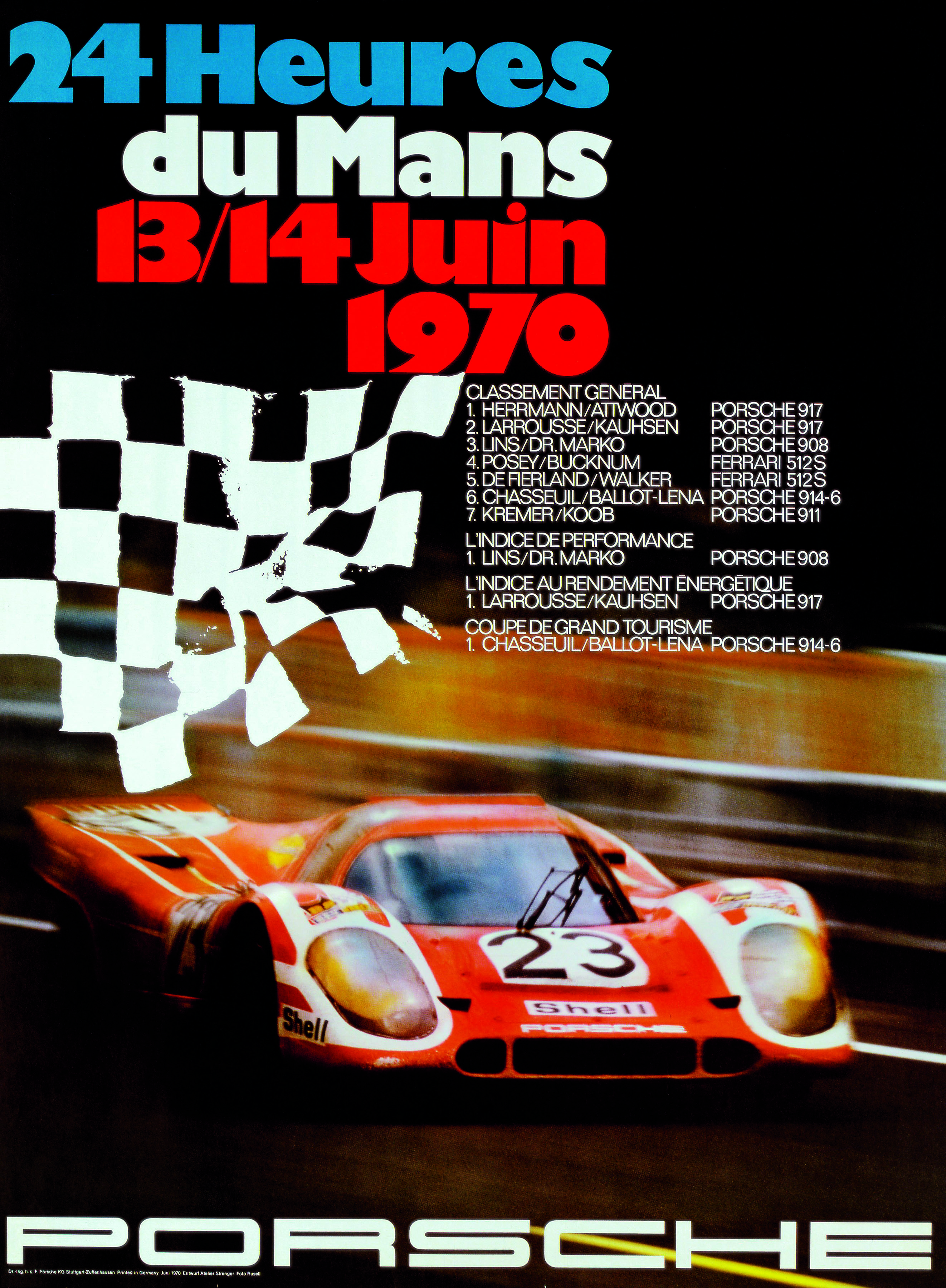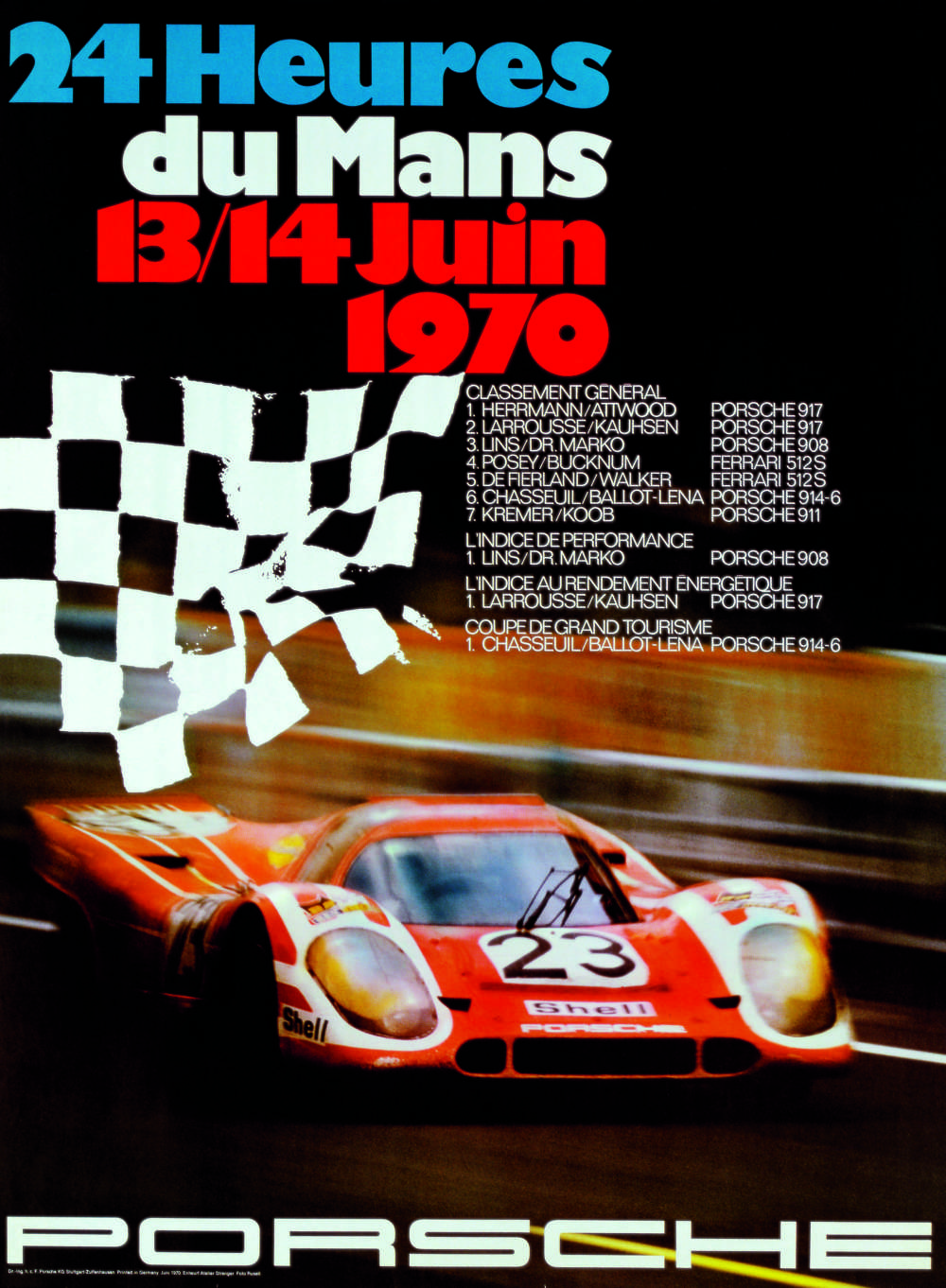 Poster of the first victory at Le Mans in 1970, with Hans Herrmann and Dick Attwood on a Porsche 917