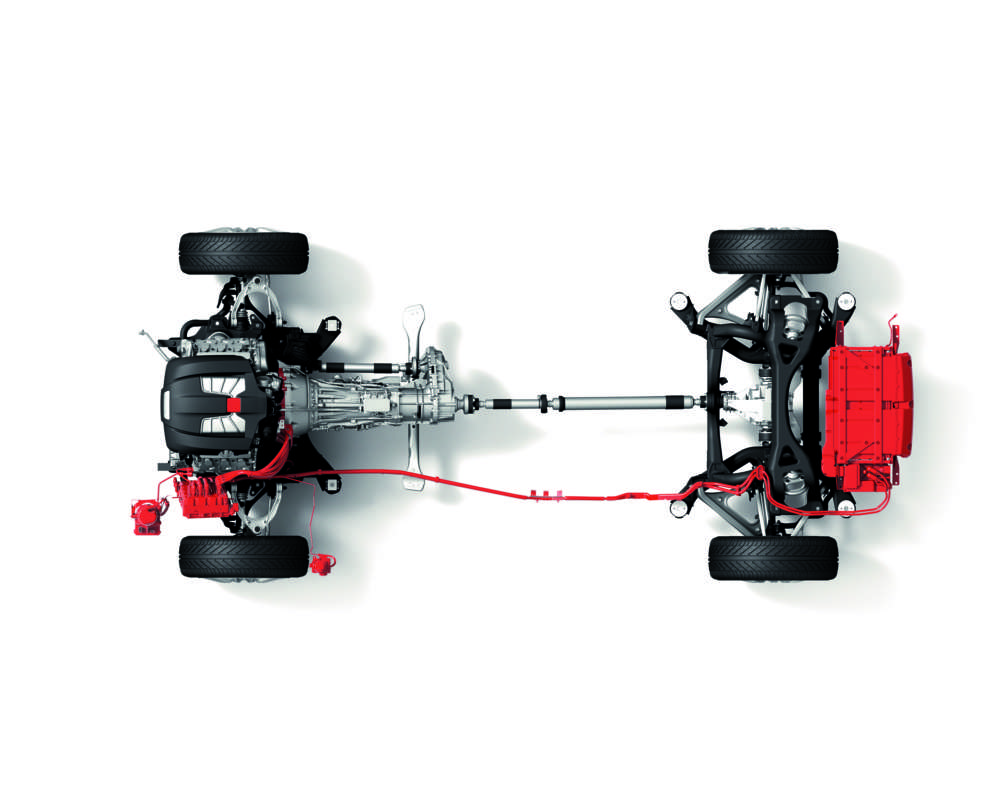Hybrid components (red) in the Porsche Cayenne: power electronics, electric motor with clutch, clutch actuator, NiMH battery (from left)