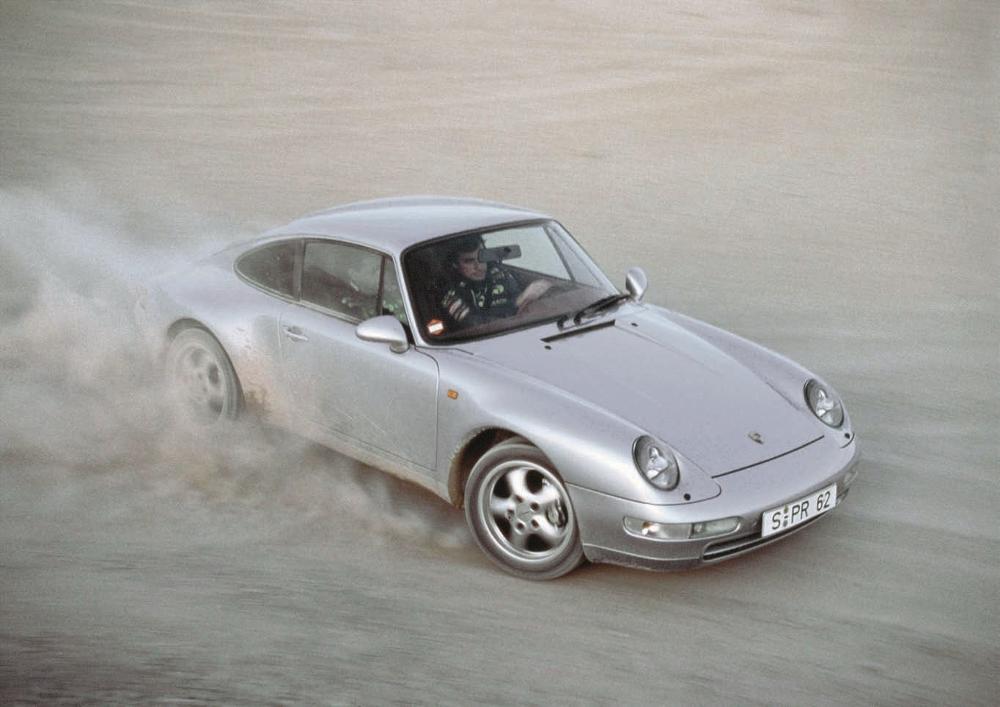 A chance to test drive the new Carrera 4 proved irresistible even to world rally champion Carlos Sainz. The 993 C4 appeared as a late 1994 model. Porsche Archiv