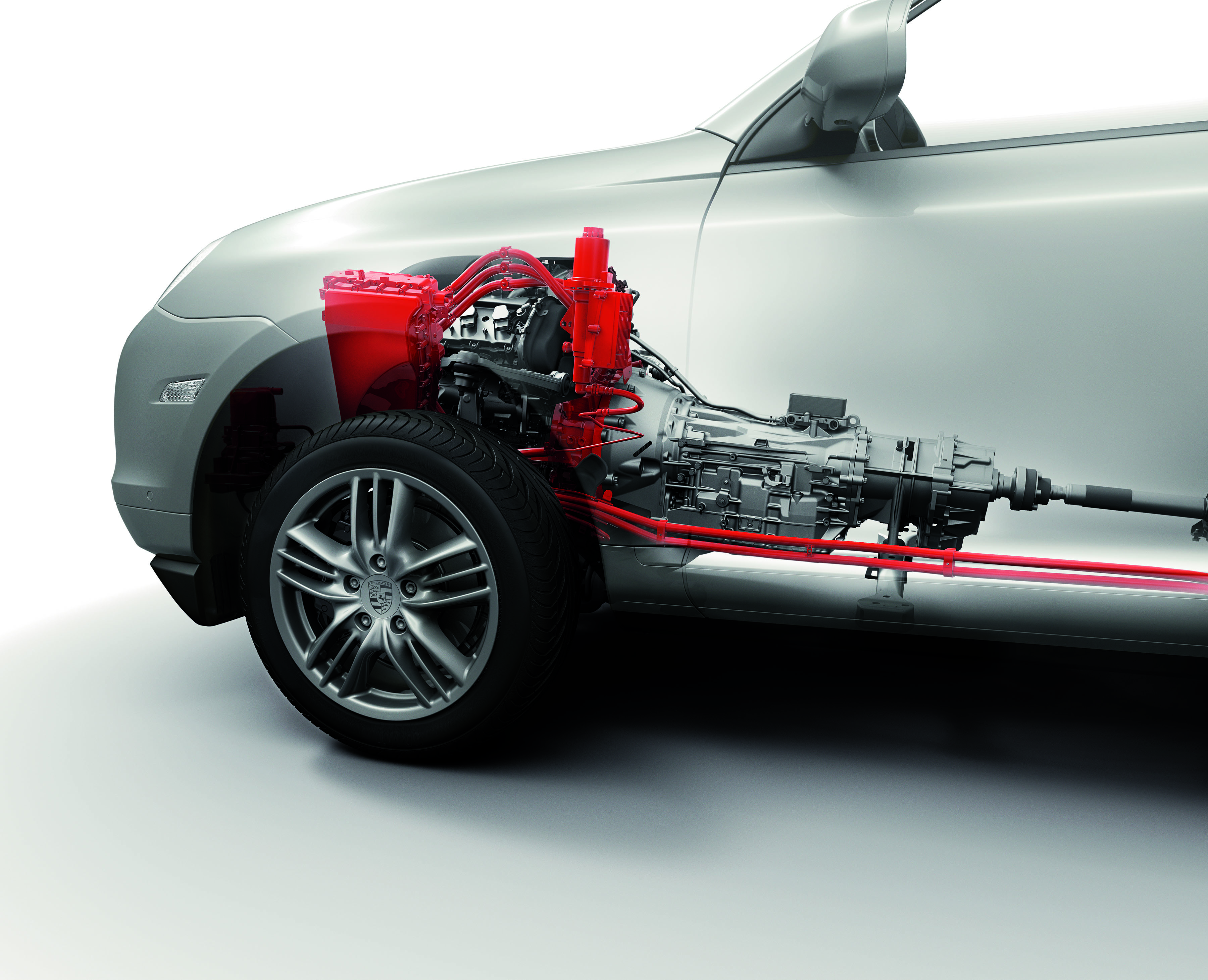 Hybrid components (red) in the Porsche Cayenne: power electronics, clutch actuator, electric motor with clutch (from left)