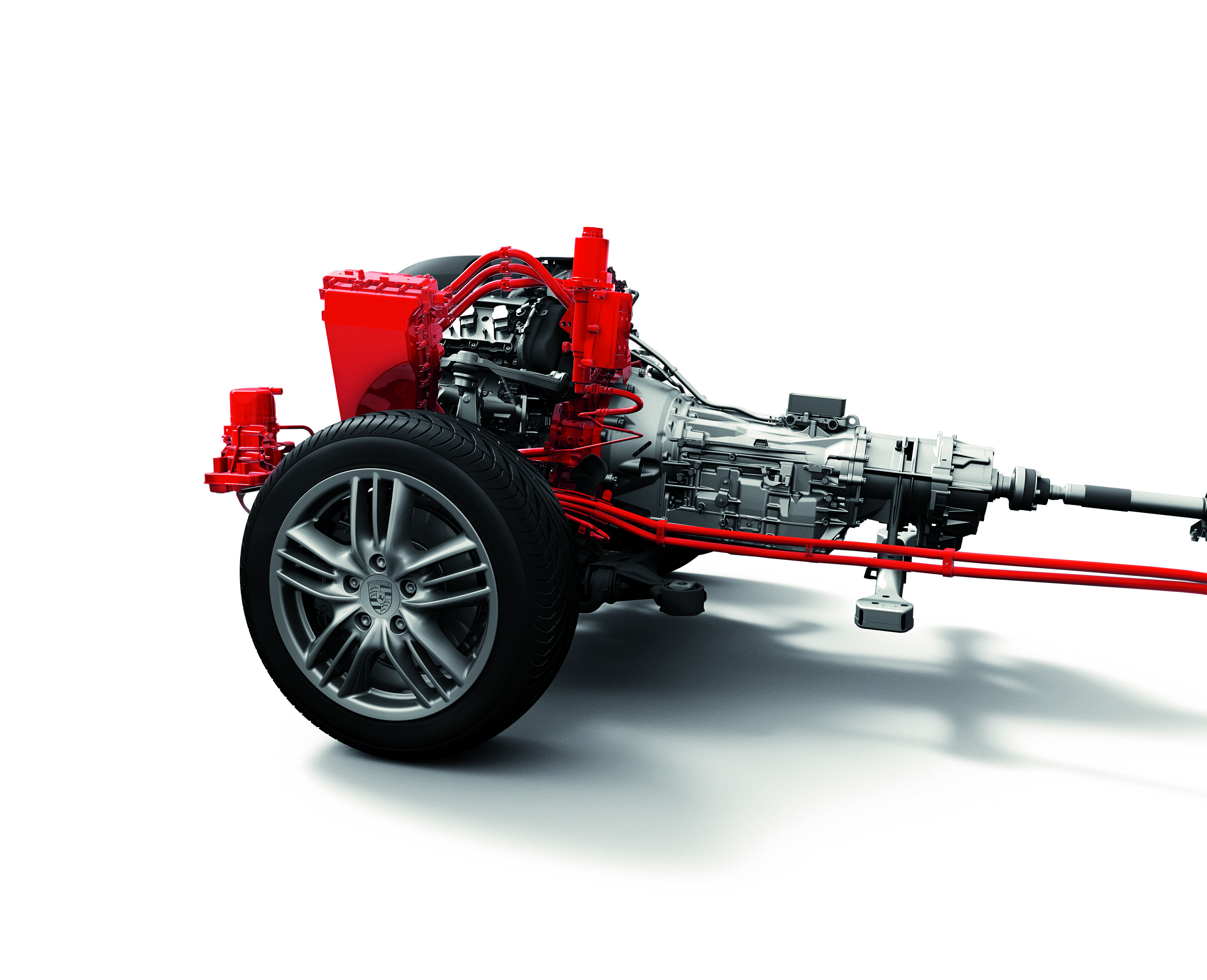 Hybrid components (red) in the Porsche Cayenne: power electronics, clutch actuator, electric motor with clutch (from left)