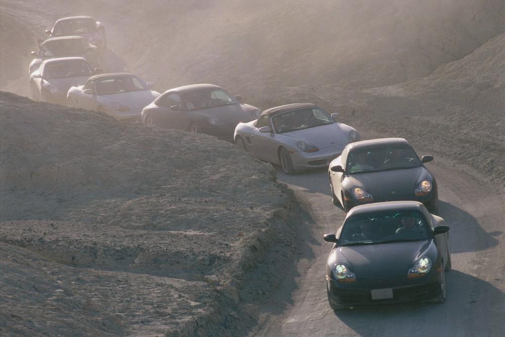 Design, engineering, and development testing took place simultaneously on both 986 Boxster and 996 car lines. Engineers performed close-follow tests such as this to challenge door seals and interior and engine filter systems. Porsche Archiv