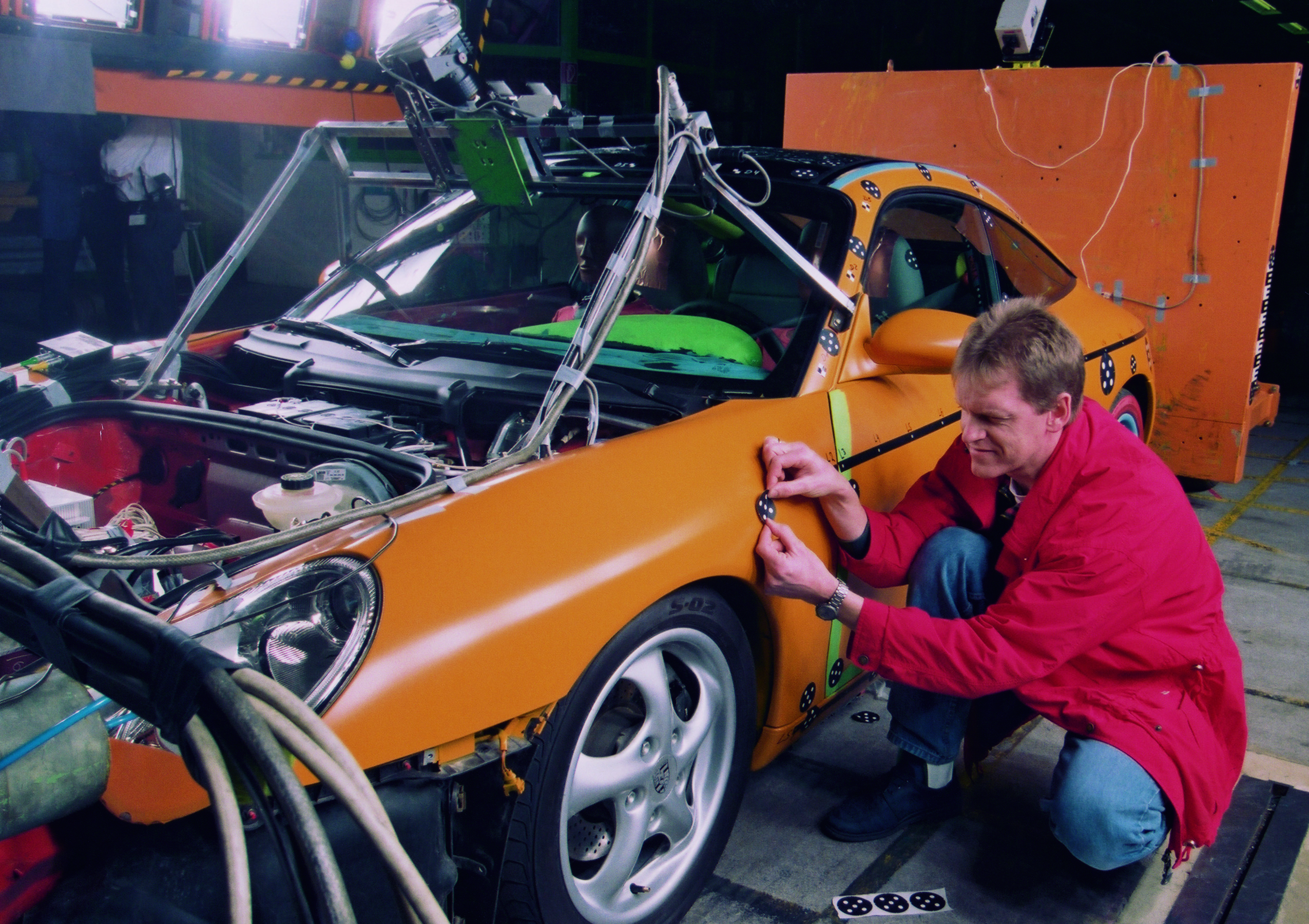 Final preparations prior to the rear-impact test with the 911 Targa:attachment of the measurement points
