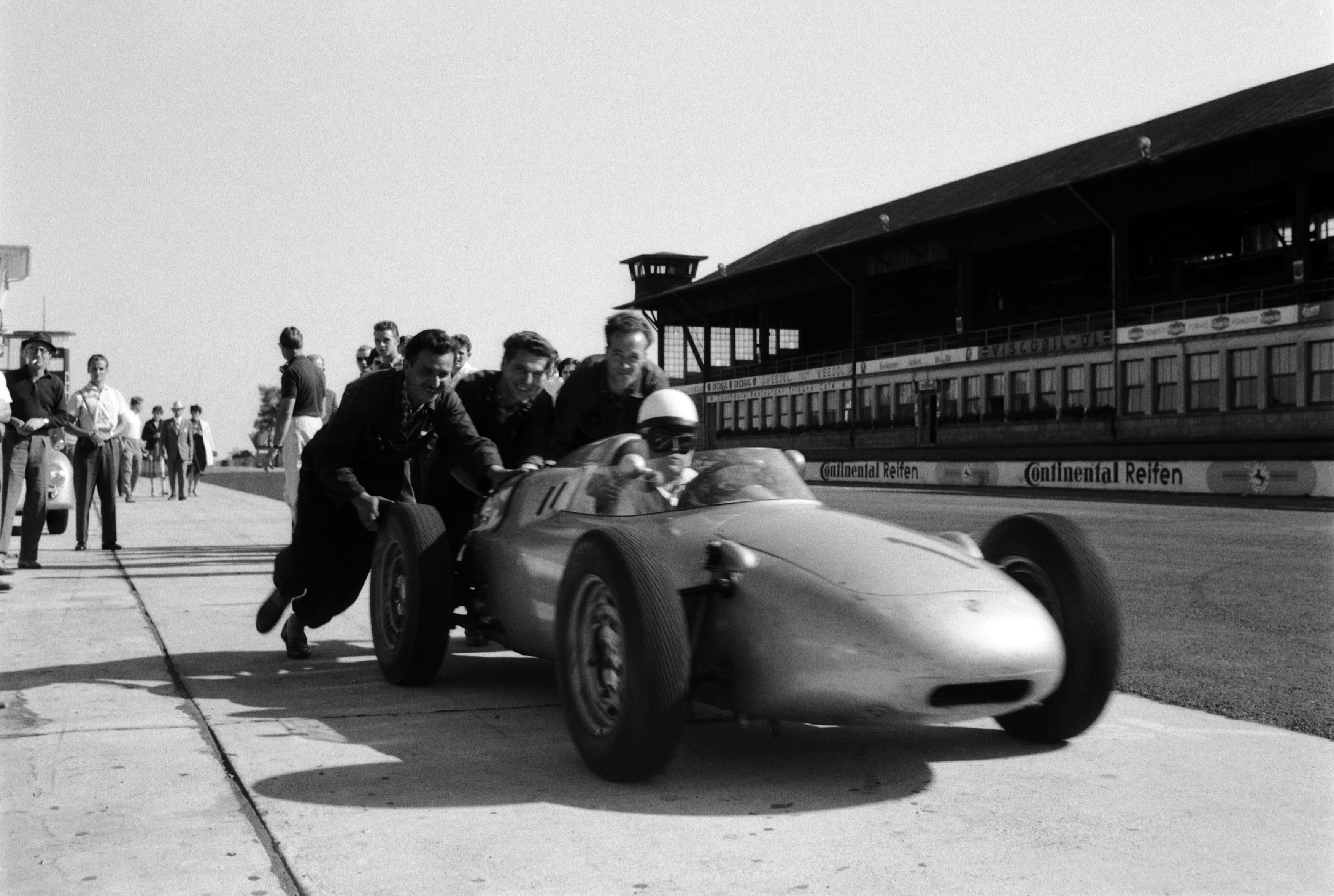 Mechanics from Porsche push Herbert Linge in the 718 / 2, Nürburgring 1959