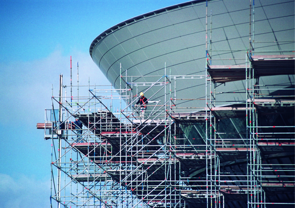 The facade of the Customer Centre is finished - the scaffolding is being removed (March 2002)