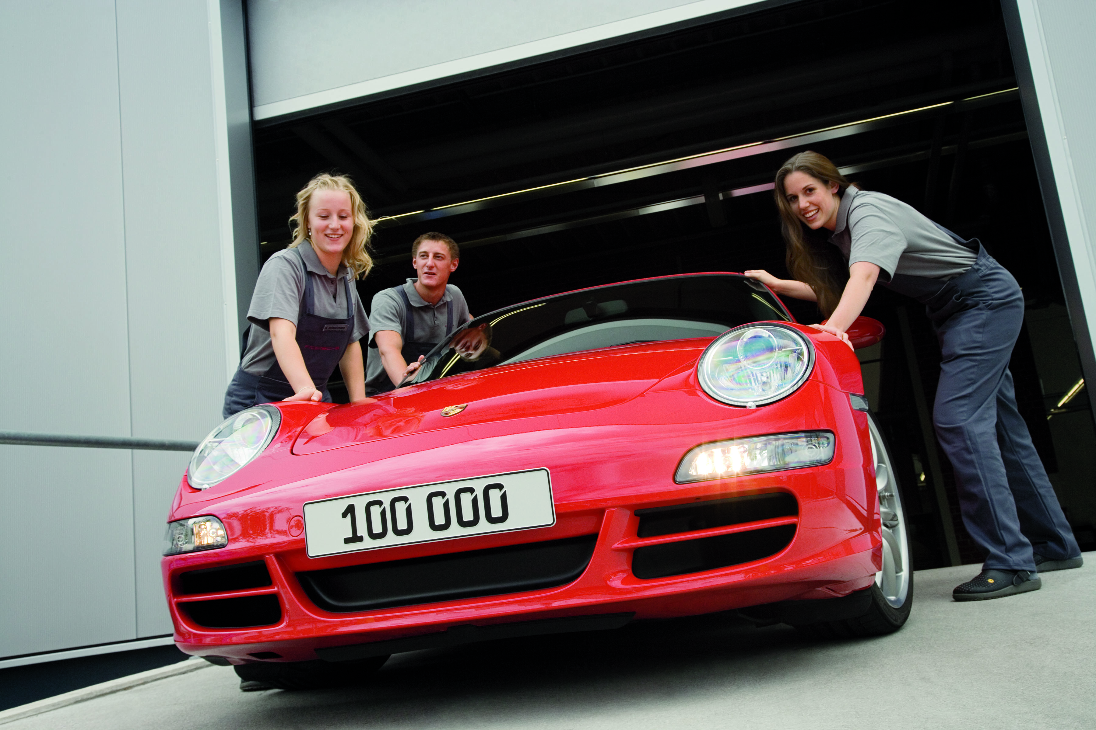The mechanics Nora Heinzelmann, Patrick Fink and Stefanie Ried (r.-l.) present the 100.000th sports car of the current 911-Generation (Type 997).