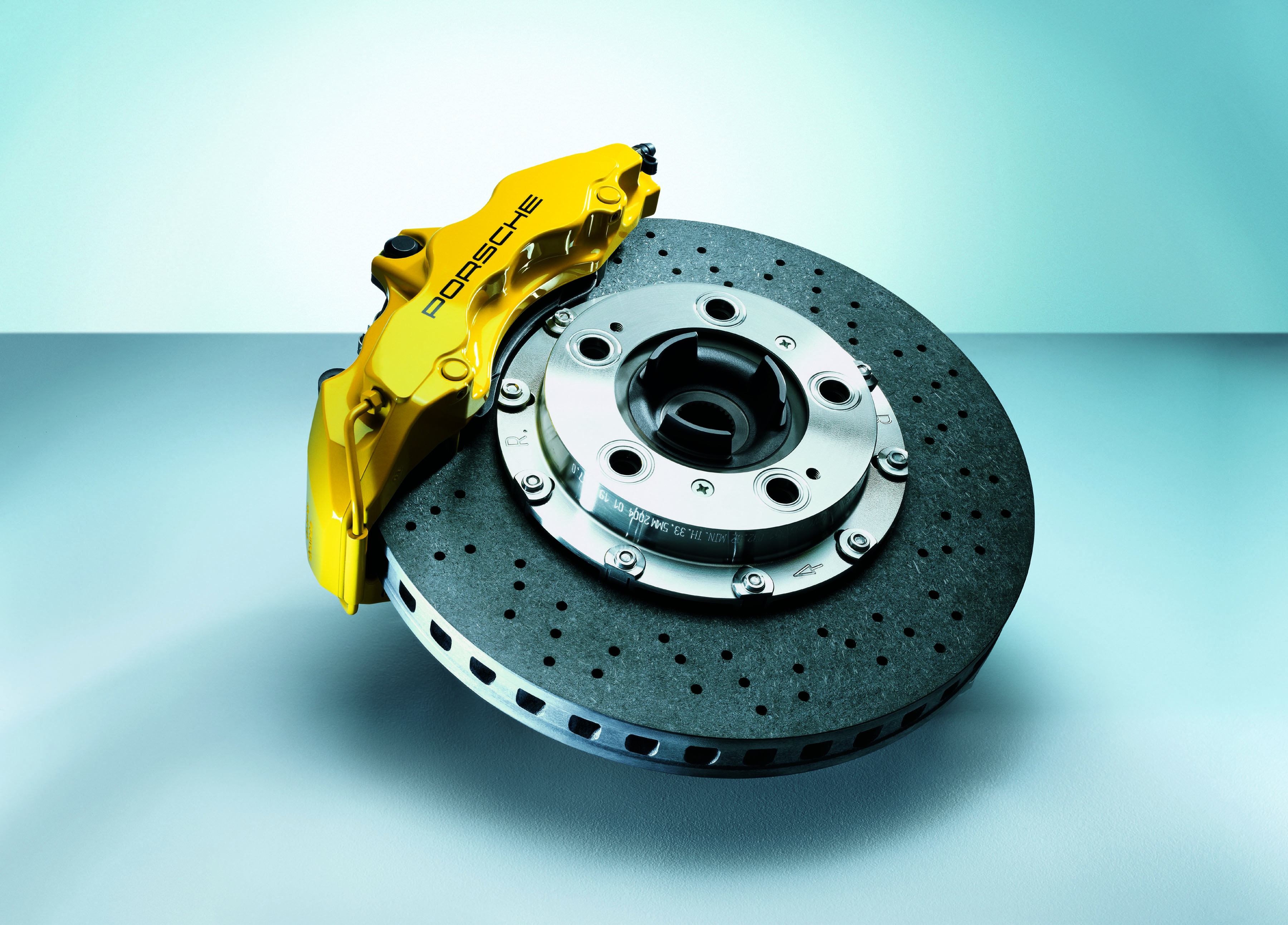 Measuring 350 millimetres or 13.78" in diameter, these cross-drilled, inner-vented composite ceramic brake discs weigh approximately 50 per cent less than metal discs.
