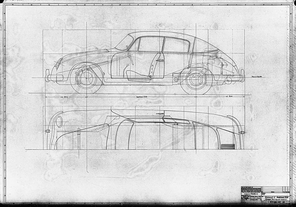 This Typ 644 coupe followed rooflines Komenda favored as they experimented with further Typ 356 forms. This full-four seater, drawn in 1:7.5-scale on August 6, 1957, used a 2,250-millimeter wheelbase. Porsche Archiv
