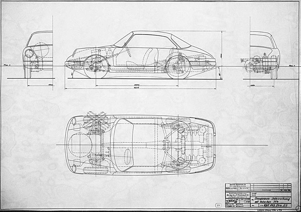 This drawing examined interior space and accommodations of the 695 body on the 754 undercarriage using a 2,300-millimeter wheelbase. Completed on December 17, 1960, it was labeled “final state 754 = T7.” Porsche Archiv