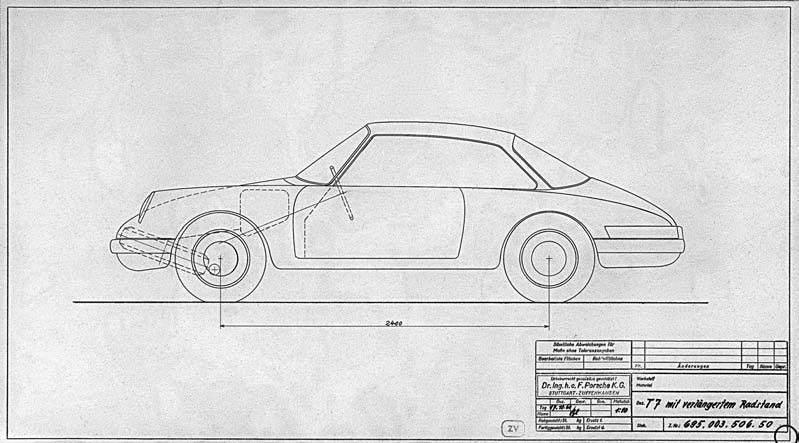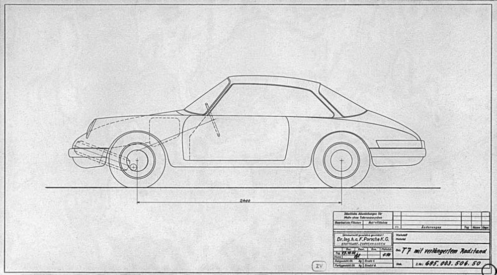 Another in a series of December 17, 1960, drawings analyzed the 2,400-millimeter wheelbase on the 695 T7 platform. Every change to wheelbase or overall length affected hundreds of other elements, most of which were ignored in this simplified illustration. Porsche Archiv