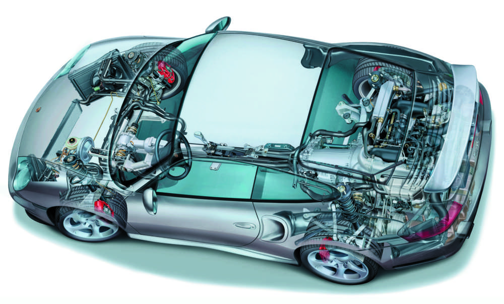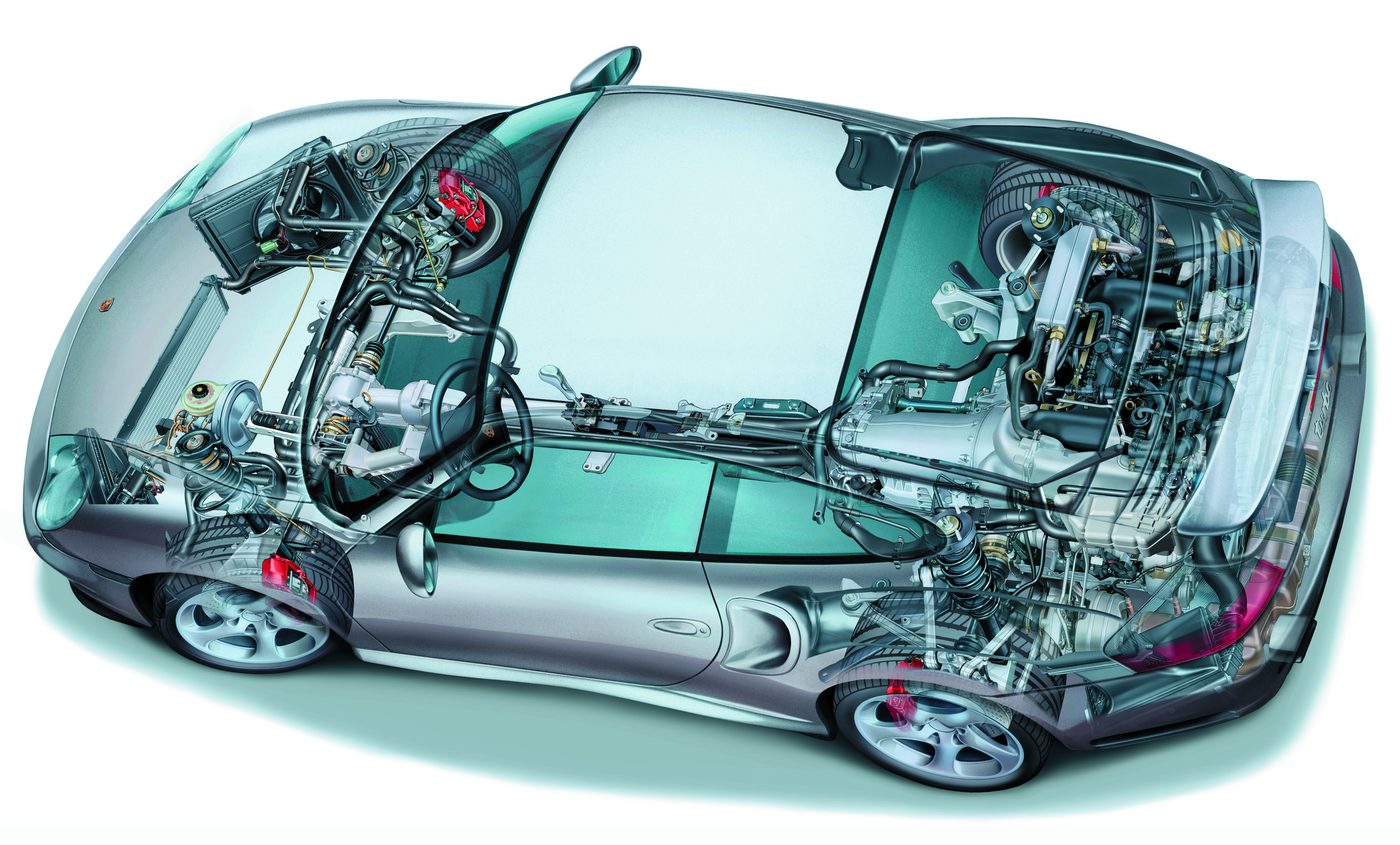 Artist's impression: Drive and running gear, lowered by ten millimetres in the 911 Turbo