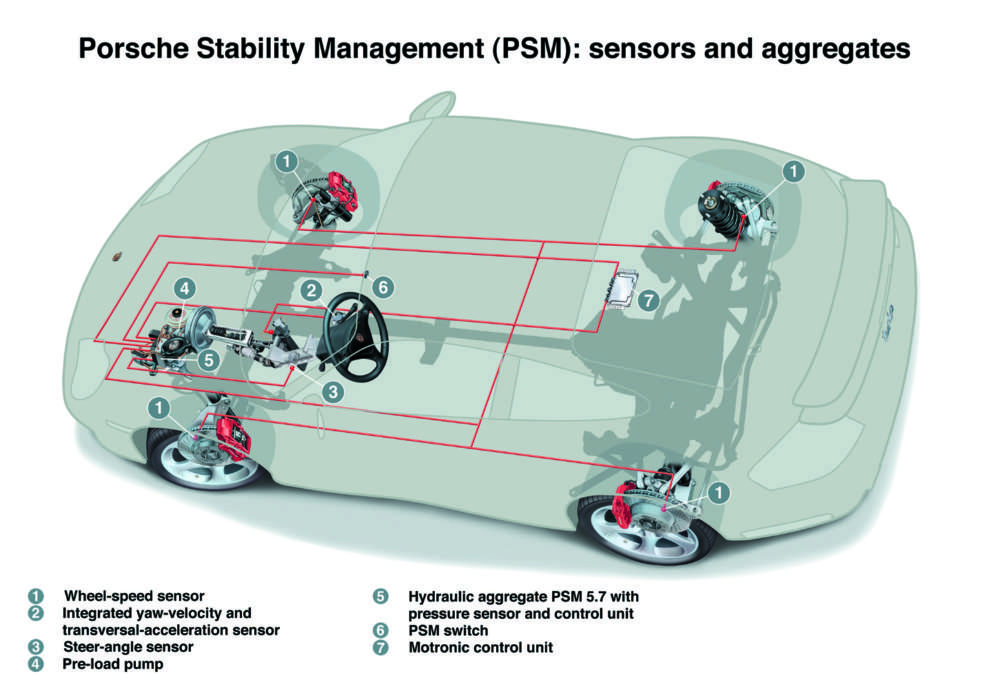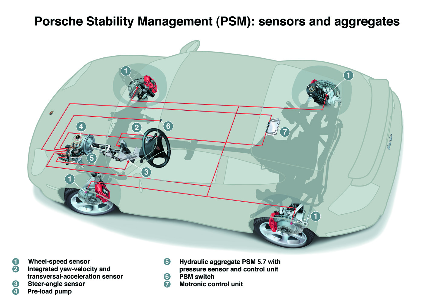 The Porsche Stability Management (PSM) stabilises the vehicle during extreme driving manoeuvres by actively engaging the engine management and brake systems