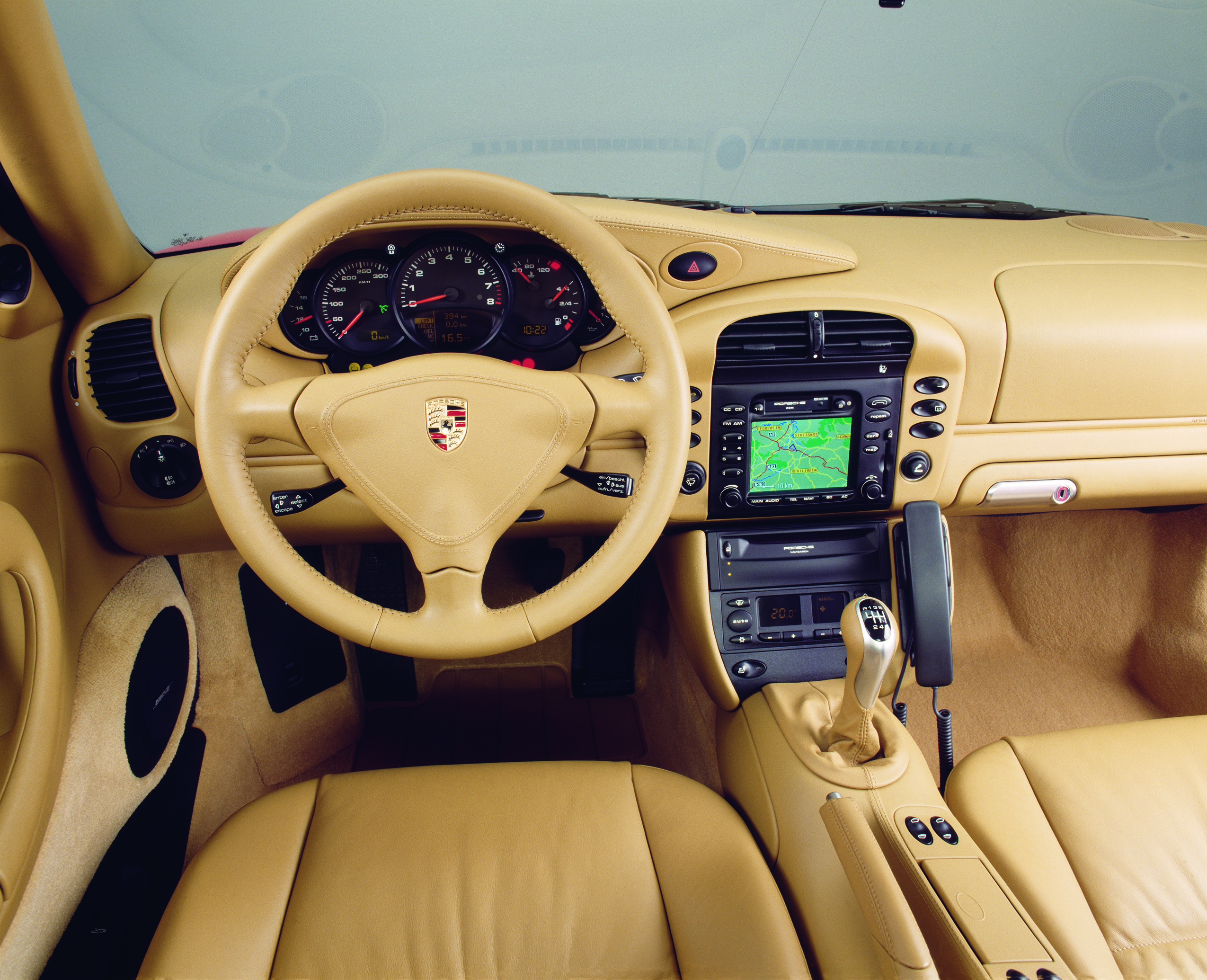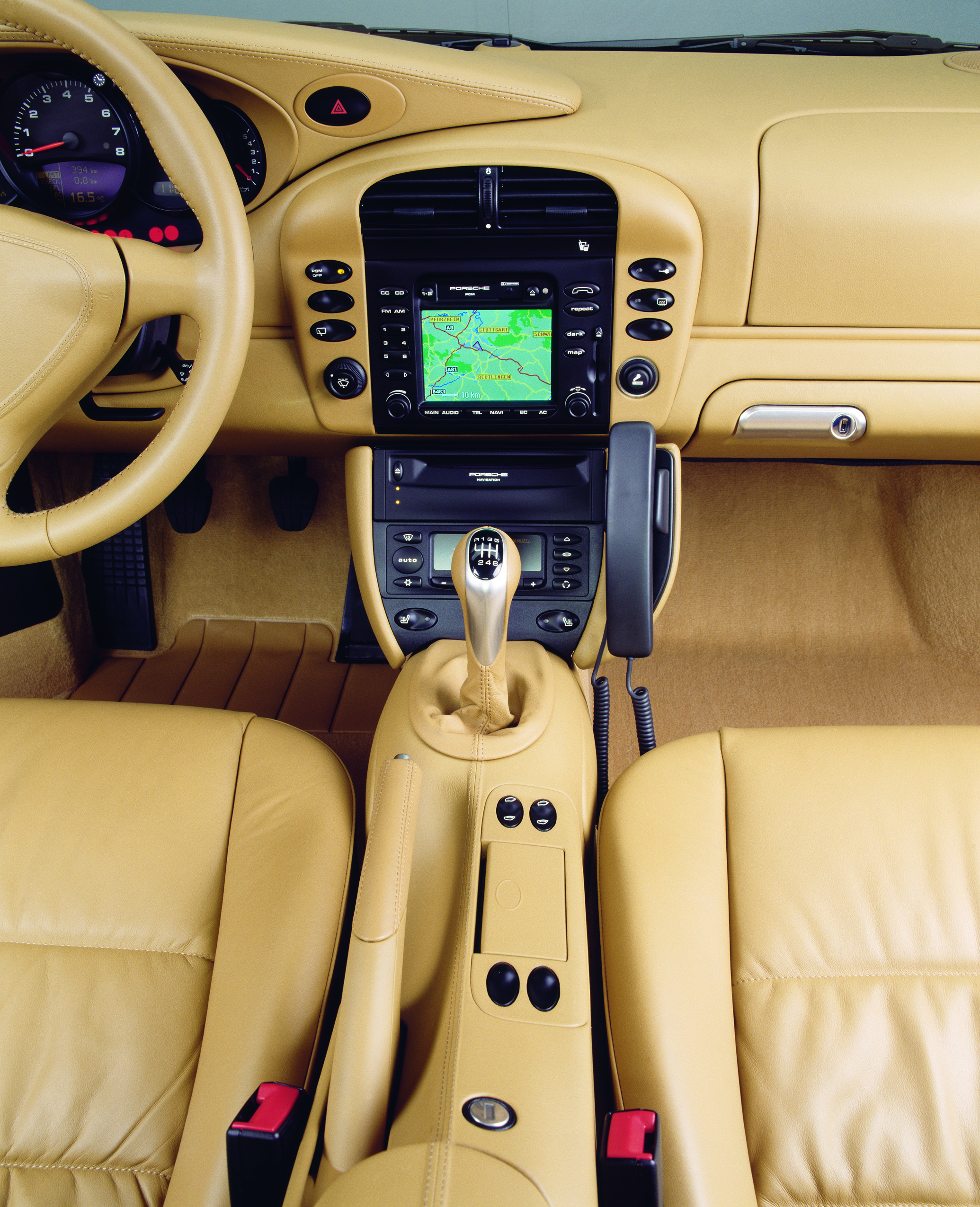 Interior equipment of the 911 Carrera 4 Coupe with Porsche Communication Management (PCM) and standard three-spoke steering wheel