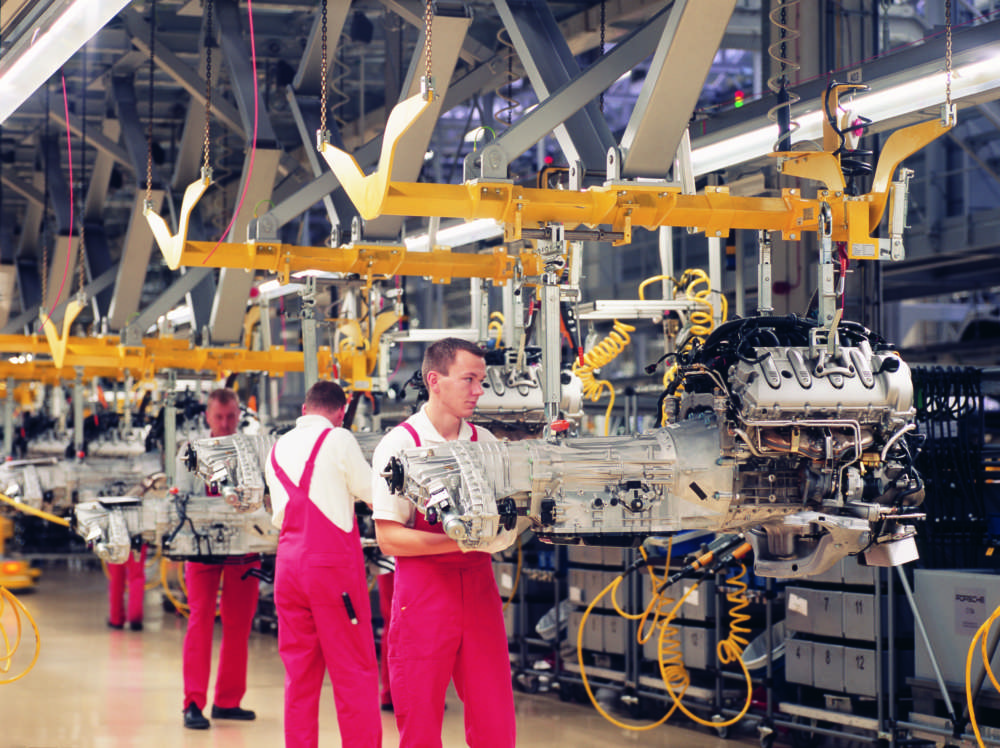 In the first step, the engine delivered from Zuffenhausen is joined to the transmission.