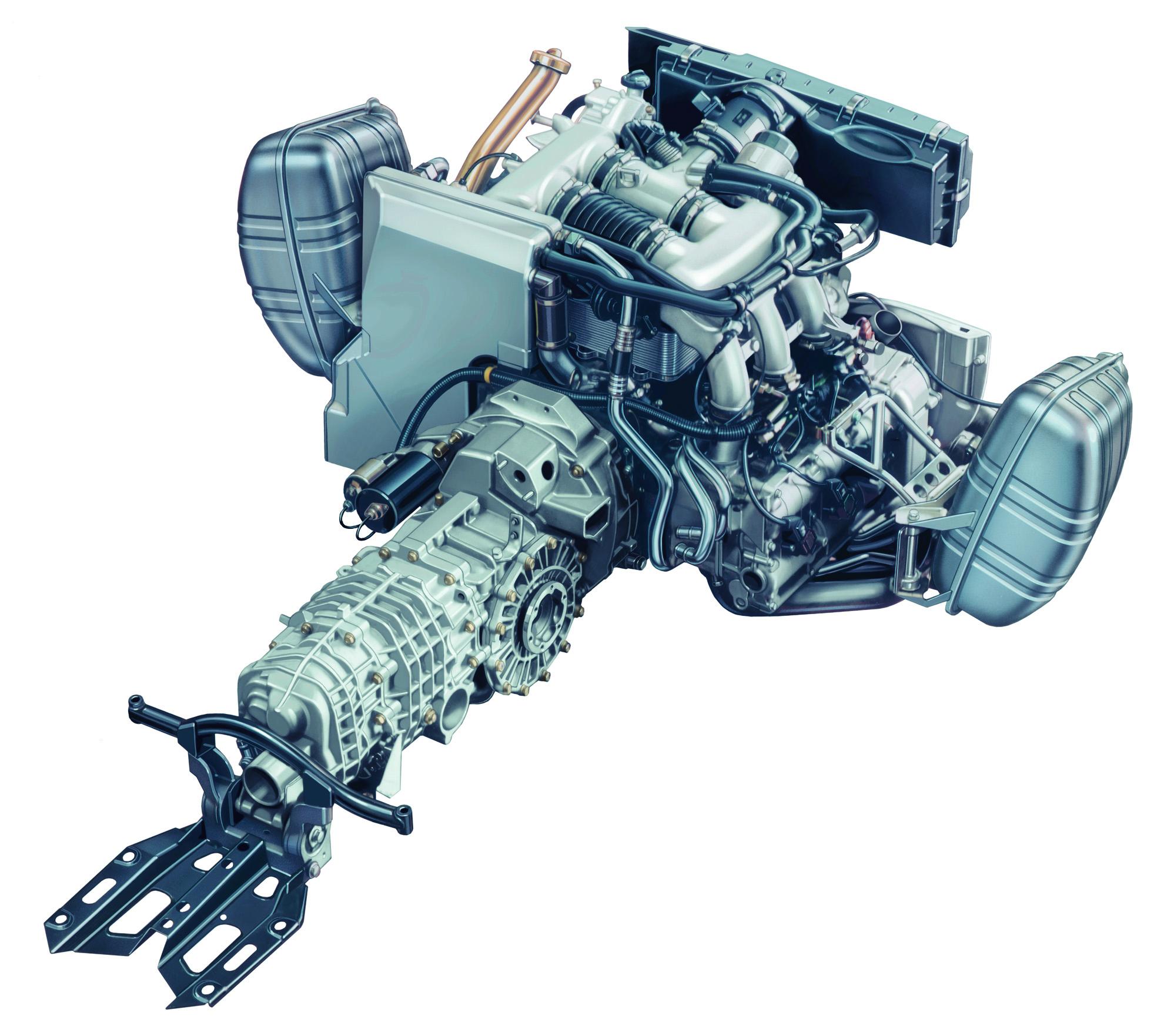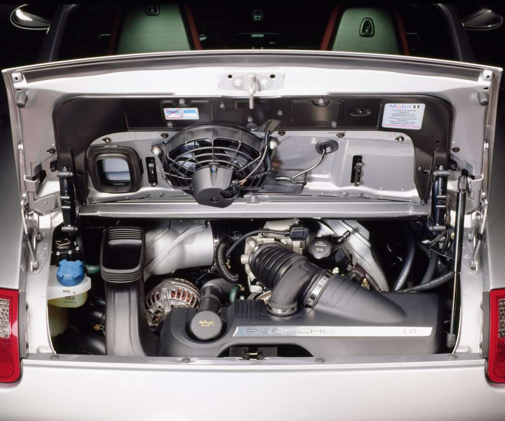 Flat six engine with exhaust system and six-speed manual transmission