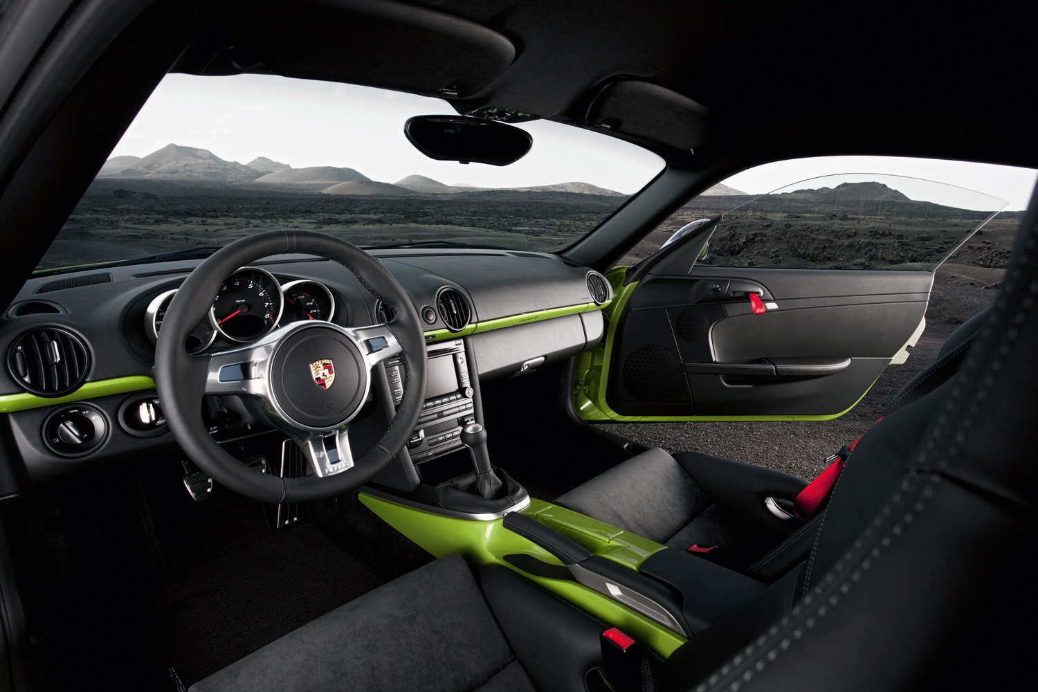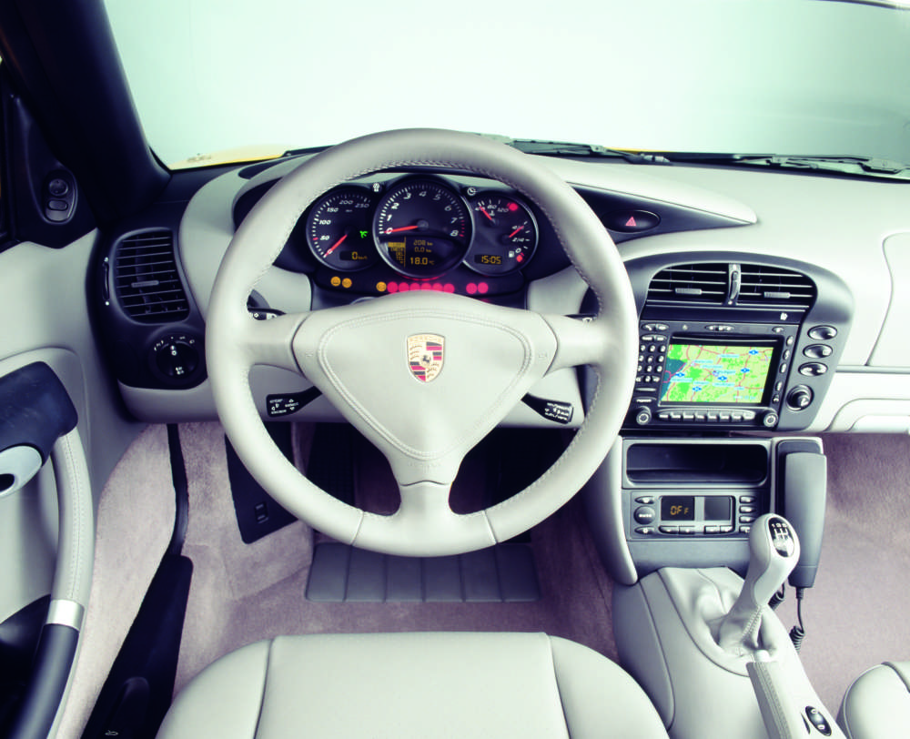 Interior equipment of the Boxster with standard three-spoke steering wheel and new Porsche Communication Management (PCM)