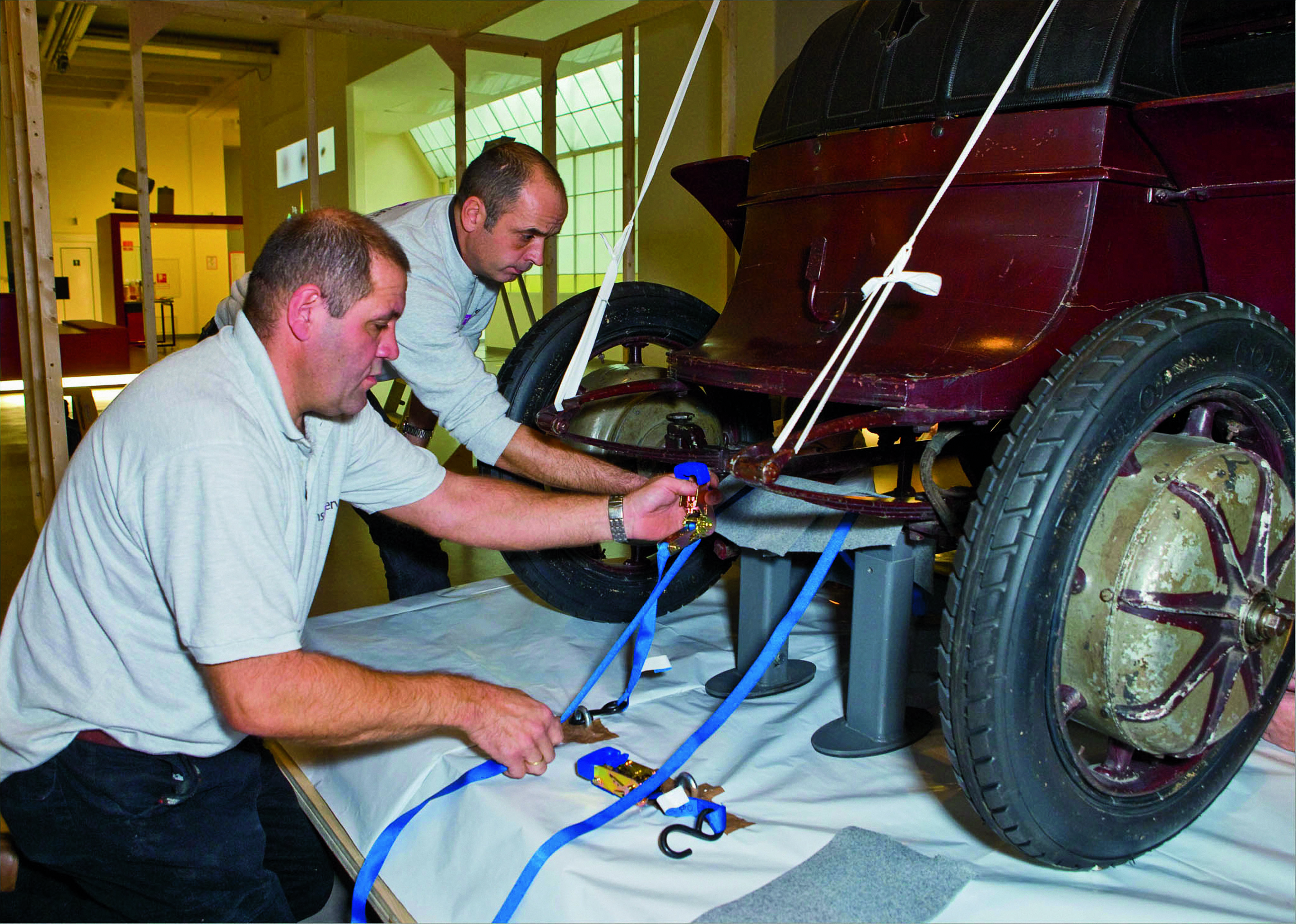 The Lohner-Porsche built in 1900 on its way from Vienna Technical Museum to the Los Angeles Auto Show. This all-electric Zero Emission Vehicle is the first car built entirely by Ferdinand Porsche and was flown to California in specially constructed packaging, in a so-called climate crate.