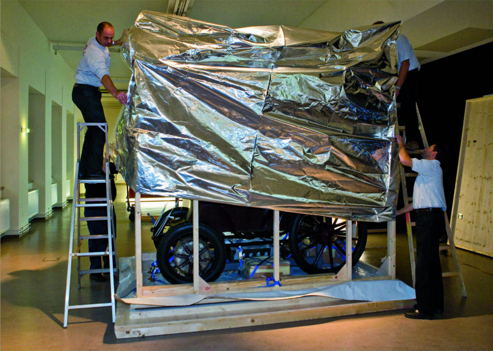 The Lohner-Porsche built in 1900 on its way from Vienna Technical Museum to the Los Angeles Auto Show. This all-electric Zero Emission Vehicle is the first car built entirely by Ferdinand Porsche and was flown to California in specially constructed packaging, in a so-called climate crate.