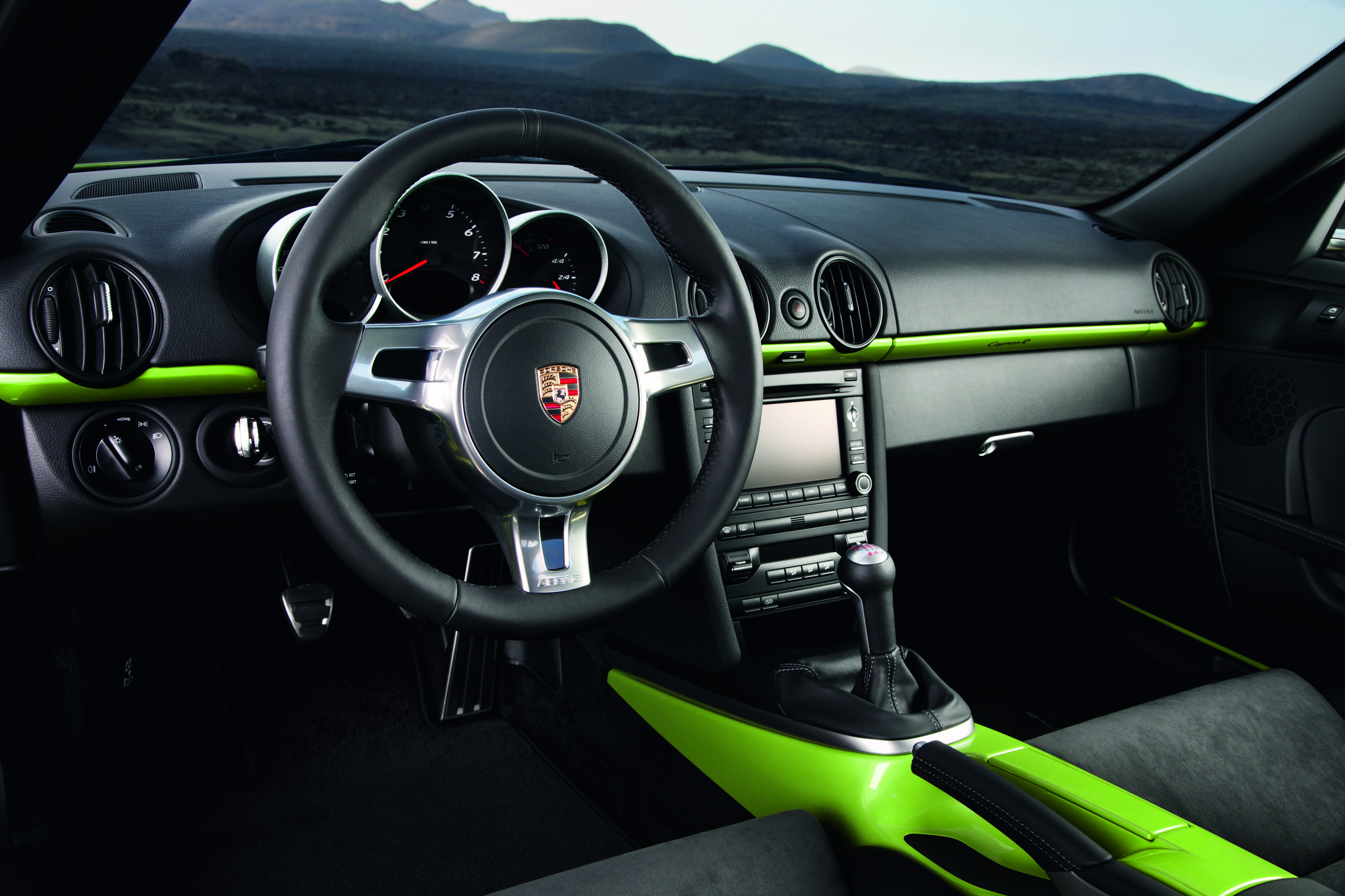 Interior equipment of the Boxster with standard three-spoke steering wheel and new Porsche Communication Management (PCM)