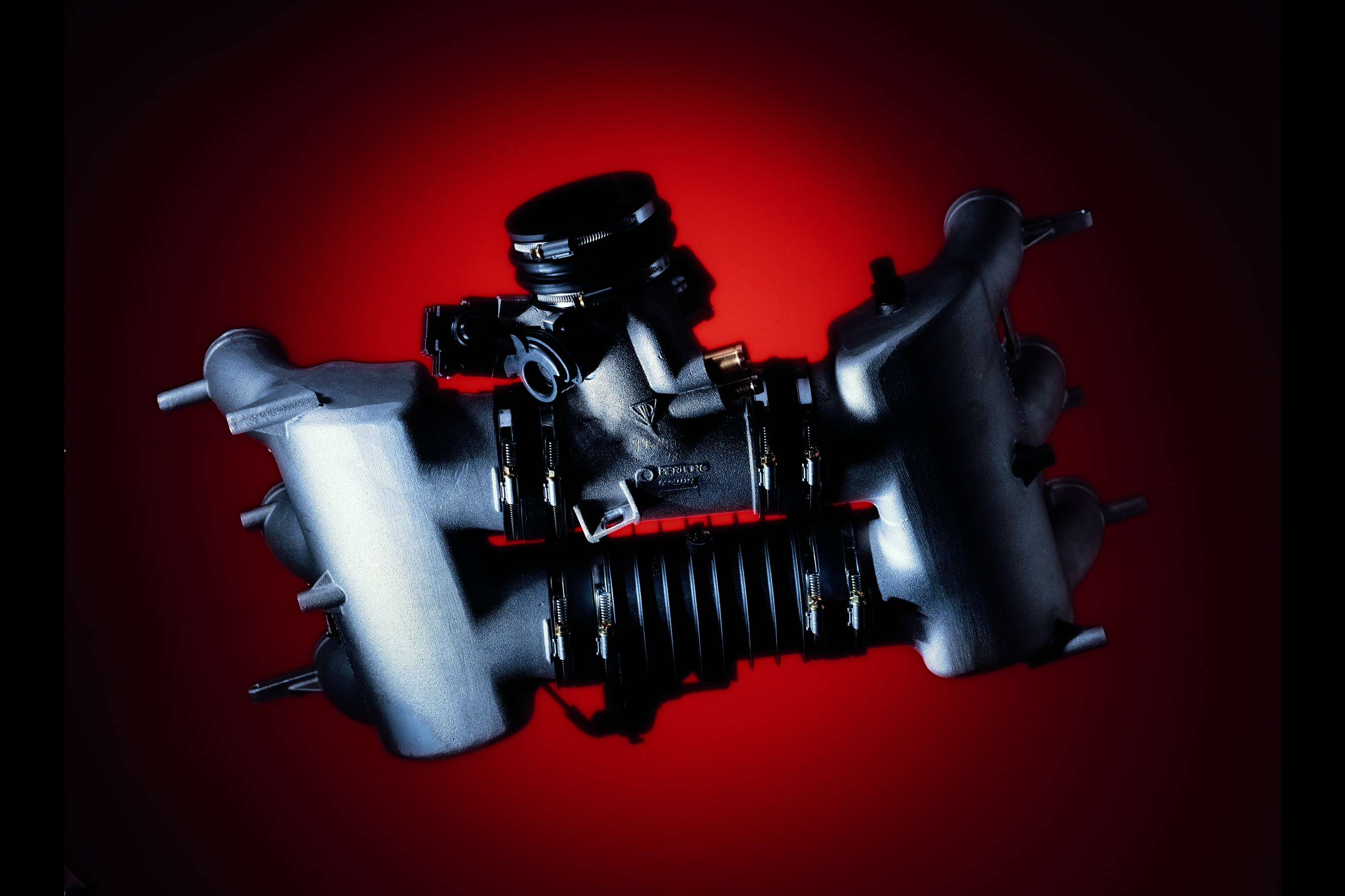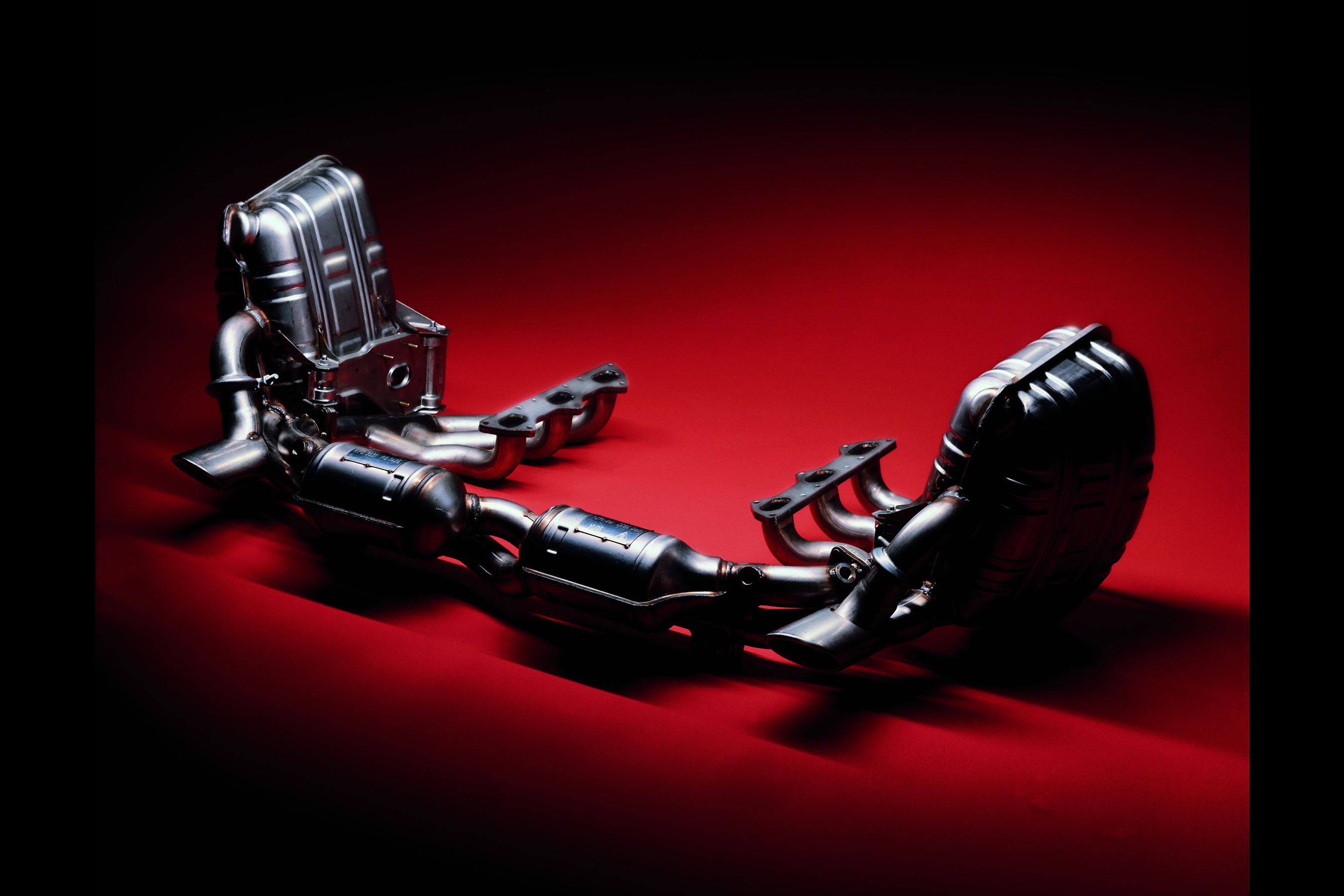 Double flow exhaust system. The exhaust gas from the right and left-hand cylinder banks are routed separately