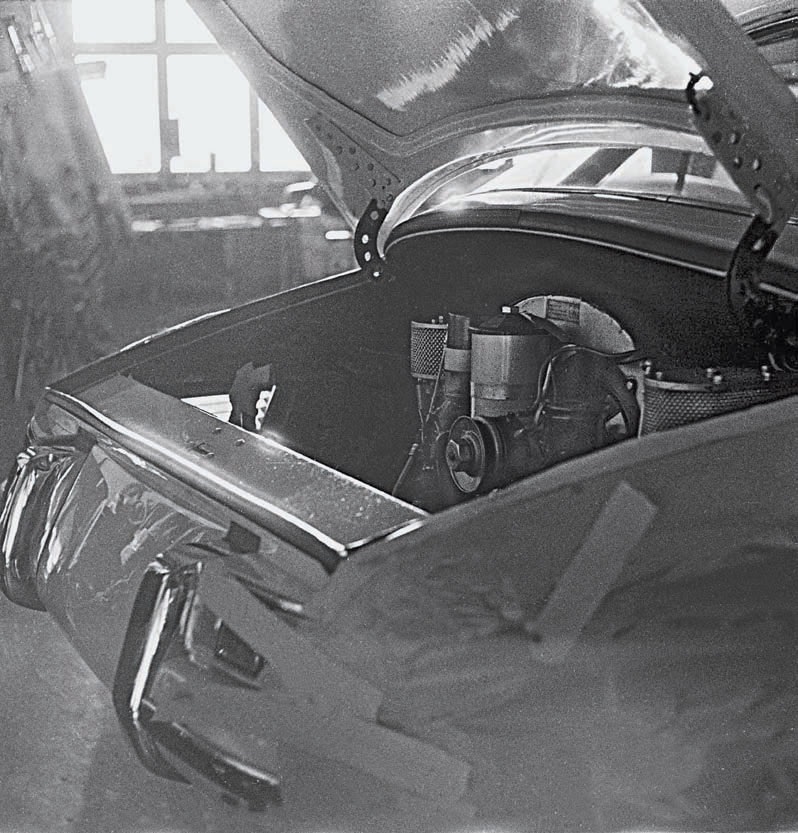 With the new engine still in development, Reutter mechanics installed a 356B version in order to create a running prototype. Gerhard Schröder recalled that Porsche staff and Reutter personnel worked long days, regularly returning to the studio after a dinner break with family and then laboring long into the night. Porsche Archiv