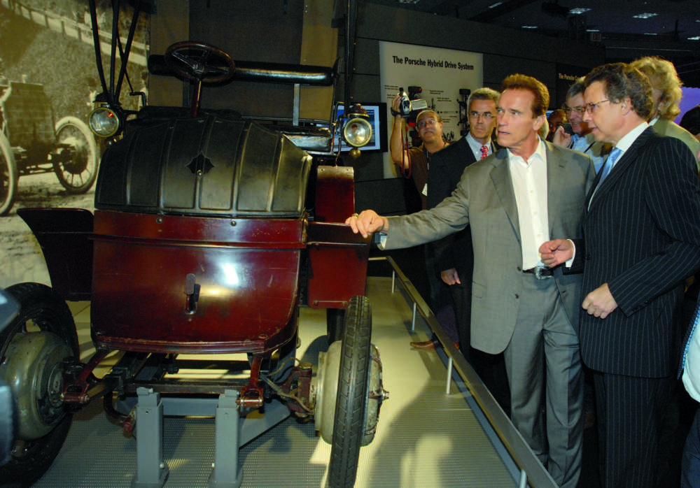 Entwicklungsvorstand Wolfgang Dürheimer (v.r.) erklärt Arnold Schwarzenegger (2.v.r.) den Lohner-Porsche. Das vollelektrische Zero-Emission-Fahrzeug wurde im Jahr 1900 von Ferdinand Porsche entwickelt. Es handelt sich dabei um einen Vorgänger des 1901 von ihm konstruierten ersten Hybrid-Fahrzeugs.
