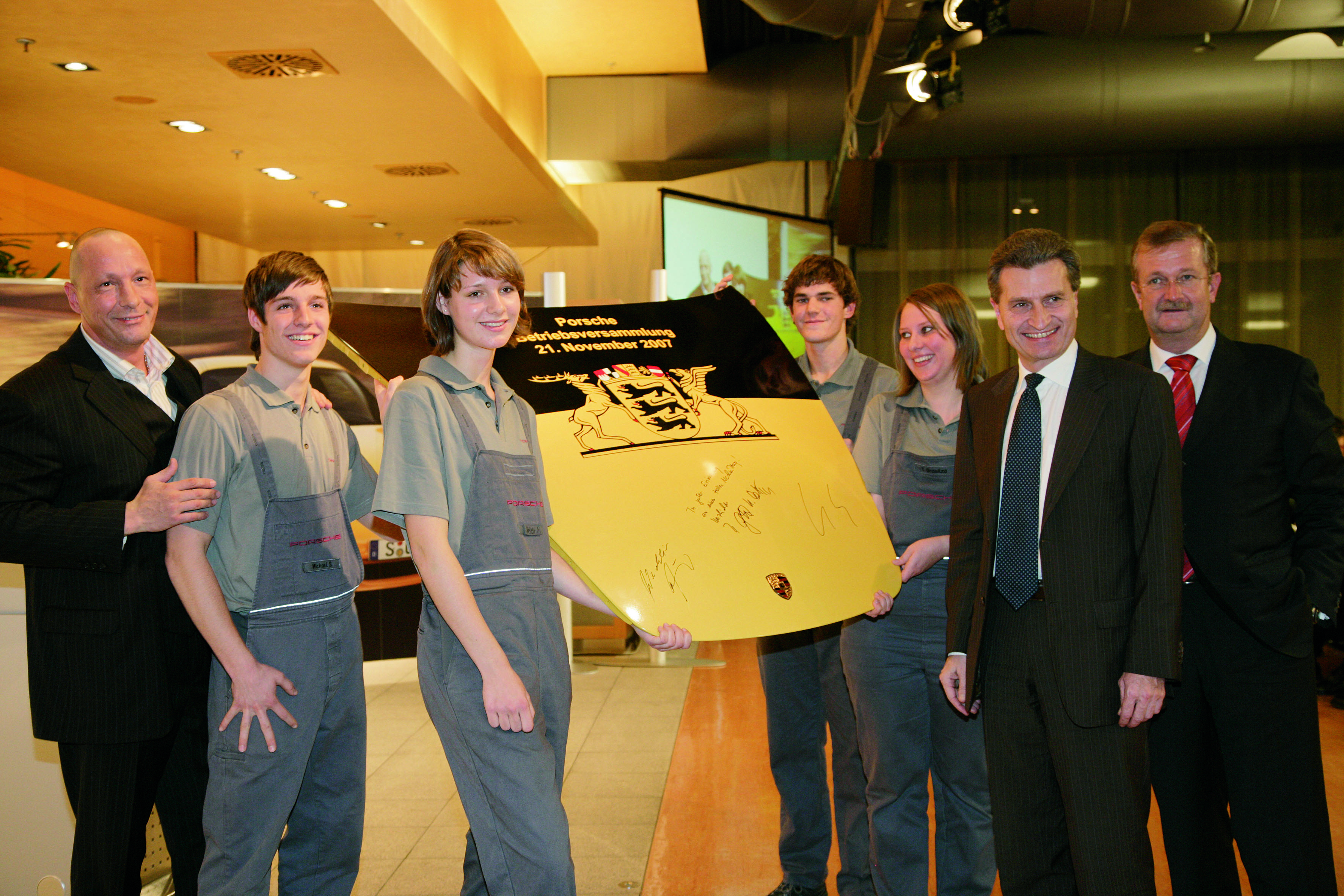 Porsche-Konzernbetriebsratsvorsitzenden Uwe Hück (l.), vier Azubis der Porsche AG, Ministerpräsident Günther Oettinger (2.v.r.) und Dr. Wendelin Wiedeking, Vorstandsvorsitzender der Porsche AG (r.), nach dem Unterschreiben auf dem Kofferraumdeckel.