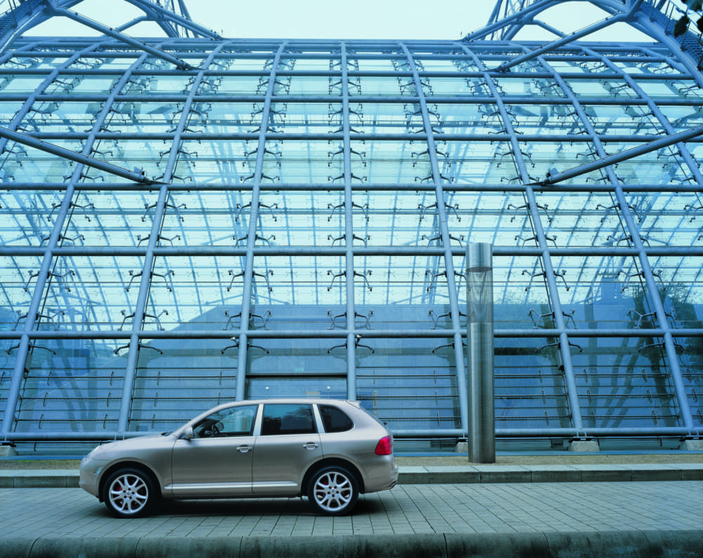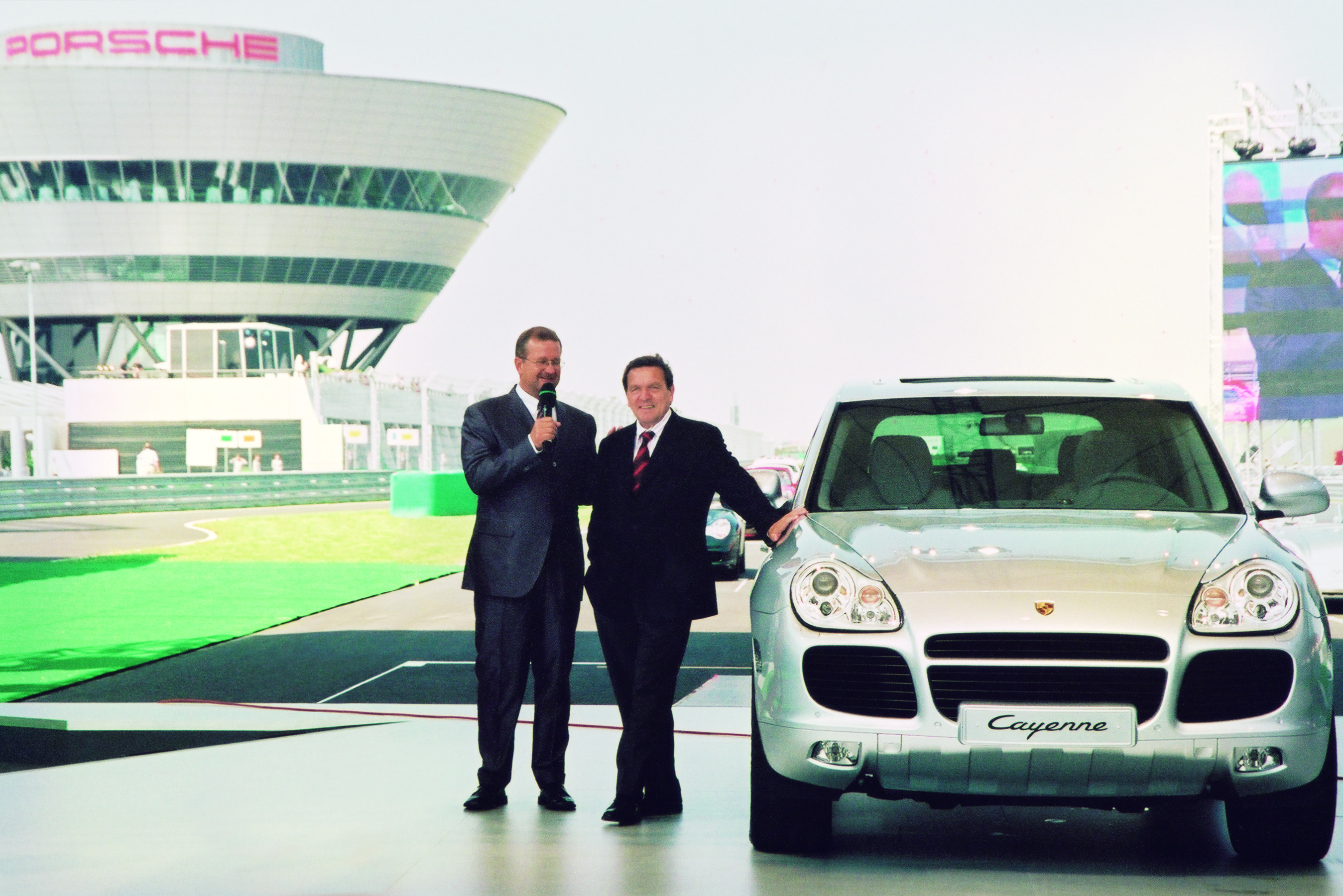 Dr. Wendelin Wiedeking and Gerhard Schröder next to the Porsche Cayenne during the official opening of the Porsche manufacturing facility in Leipzig.