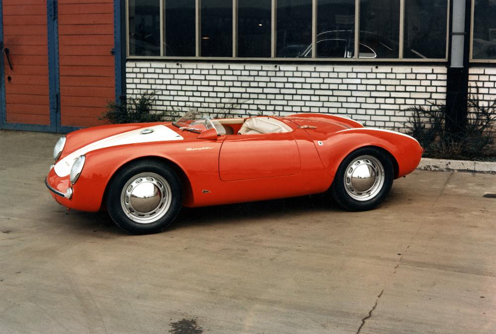 The Neuester Sportwagen Typ 550 Spyder was one of Erwin Komenda’s finest collaborations with modeler Heinrich Klie. This early model was photographed outside Wendler Karosserie, Reutlingen, before its first speed test. Porsche Archiv