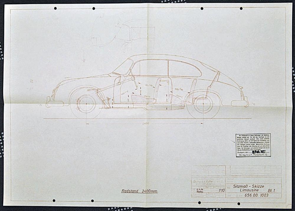 The Typ 656 on a 2,400-millimeter wheelbase provided comfortable rear seat room with two-thirds of a meter from seat back to seat back. This 1:10-scale seat measurement sketch appeared July 2, 1954. Porsche Archiv