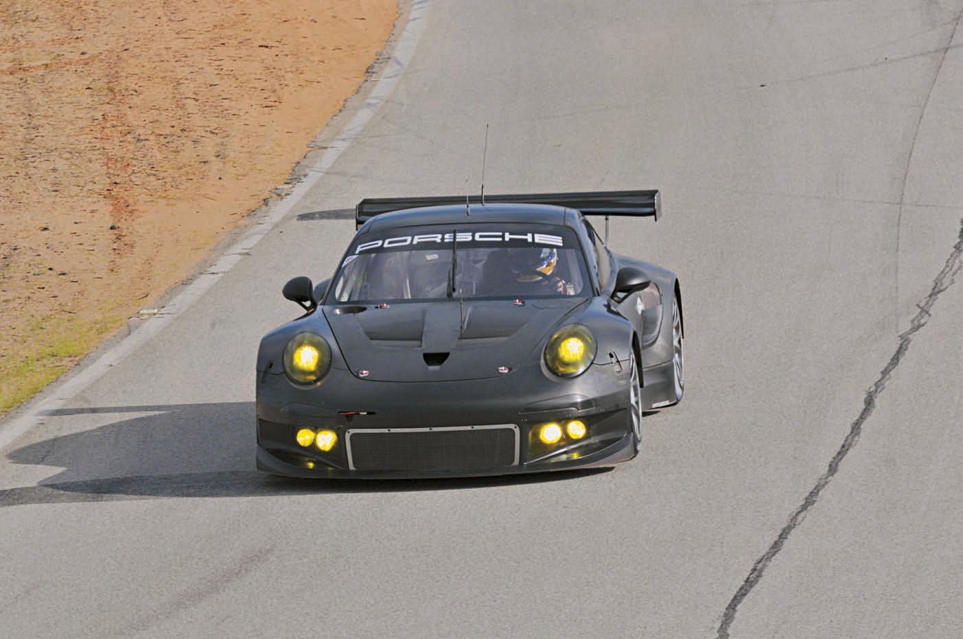 Accelerating out of Laguna Seca’s hairpin turn number 11 during the 2004 ALMS race, Mark Leib and Romain Dumas exchanged duties holding off Corvettes, Ferraris, and Aston Martins. Leib/Dumas won GT class in their GT3 RSR, finishing eighth overall. Porsche Archiv