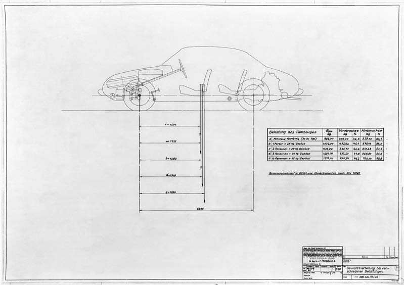 Nothing is left to chance in the design of an automobile. This drawing, made on the 695 platform on February 14, 1957, examined the change in weight distribution by the number of occupants and luggage. Porsche Archiv