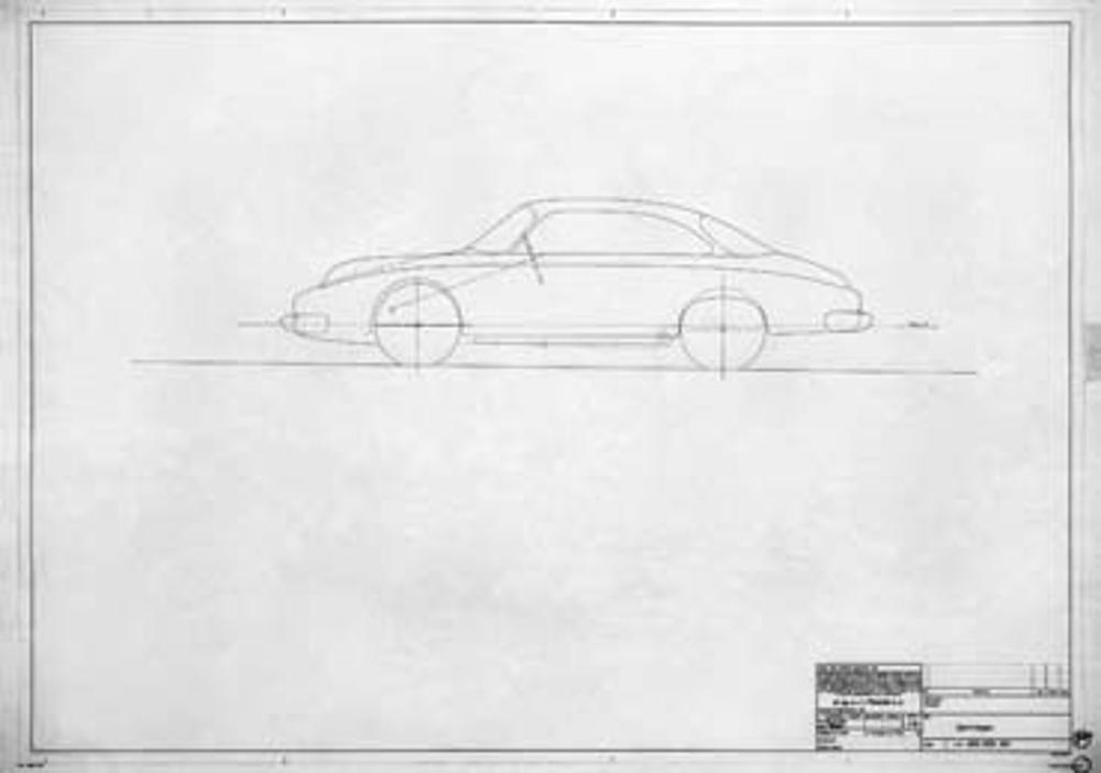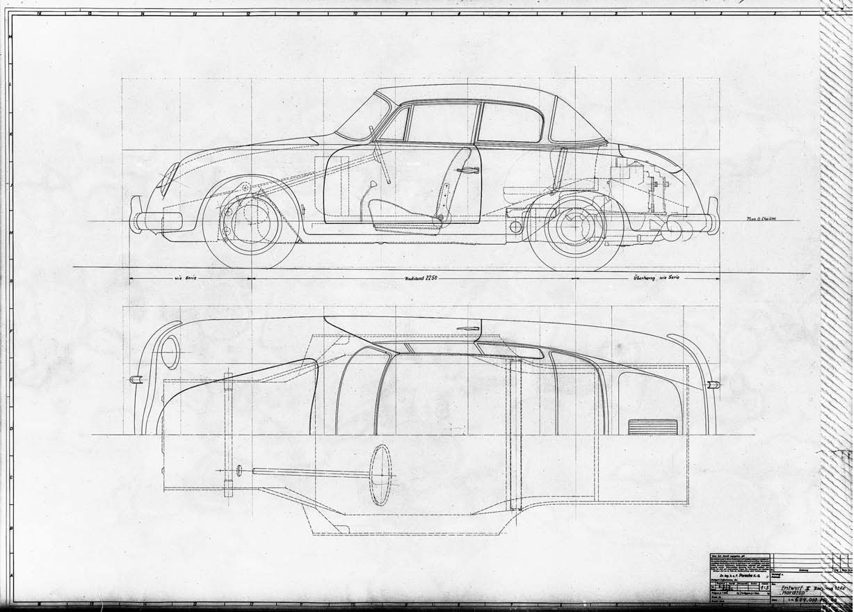 This February 6, 1957, plan of the Typ 644 put the car on the 2,250-millimeter wheelbase. This 1:5 drawing designated the car as a hardtop. Porsche Archiv
