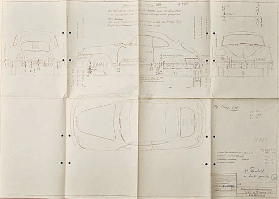 This Typ 644 coupe followed rooflines Komenda favored as they experimented with further Typ 356 forms. This full-four seater, drawn in 1:7.5-scale on August 6, 1957, used a 2,250-millimeter wheelbase. Porsche Archiv