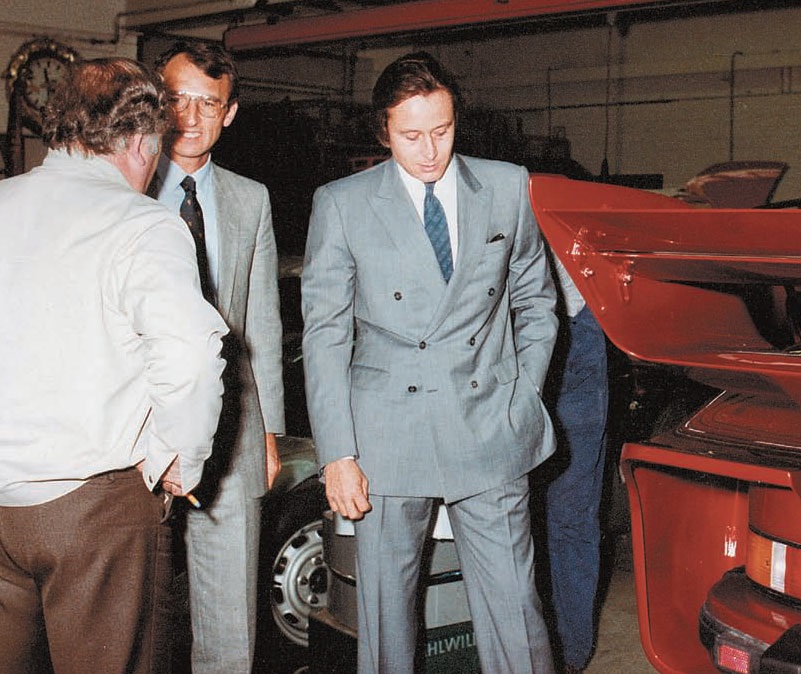 As chief executive of Techniques Avant-Guard (TAG), Mansour Ojjeh, right, collaborated with Porsche on engine development and other technologies for the McLaren F1 team partnership. Here with Manfred Jantke (Porsche press director), Ojjeh inspected a 935 that Sonderwunsch developed for road use for him. Porsche Archiv